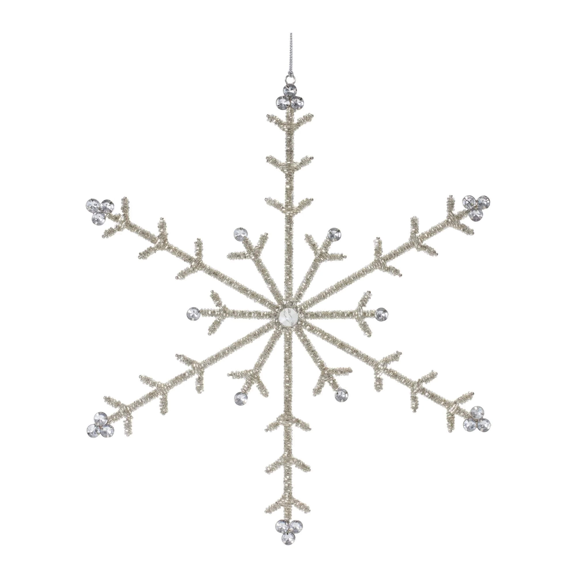 Enhance your Christmas tree with this exquisite set of six snowflake ornaments. The chic silver tones, jewel and beaded design, and traditional snowflake shape create a memorable display. With a durable jewel composition and string hanger, these ornaments are built to last for seasons to come. Whether for your own home or as a thoughtful gift, these ornaments are guaranteed to bring smiles and festive charm to any space.