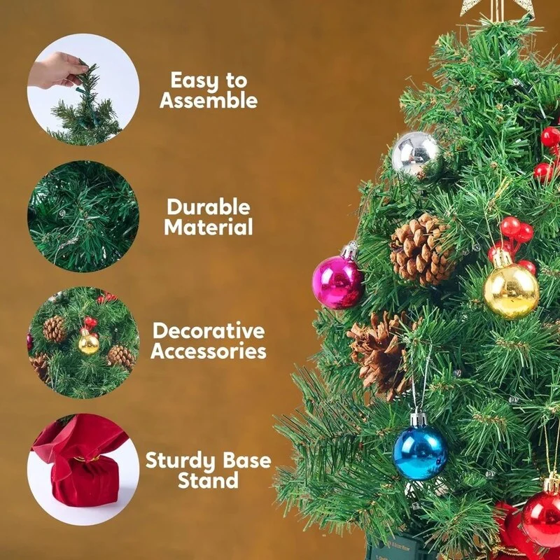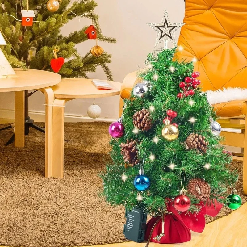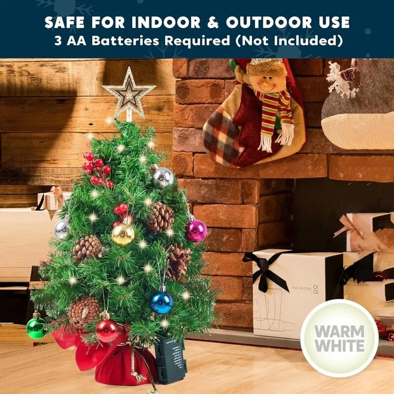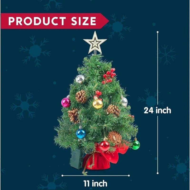 - INCLUSIONS: Includes 23" Prelit Tabletop Christmas Tree with multicolored lights, holly berries, pine cones, star tree topper & ornaments
