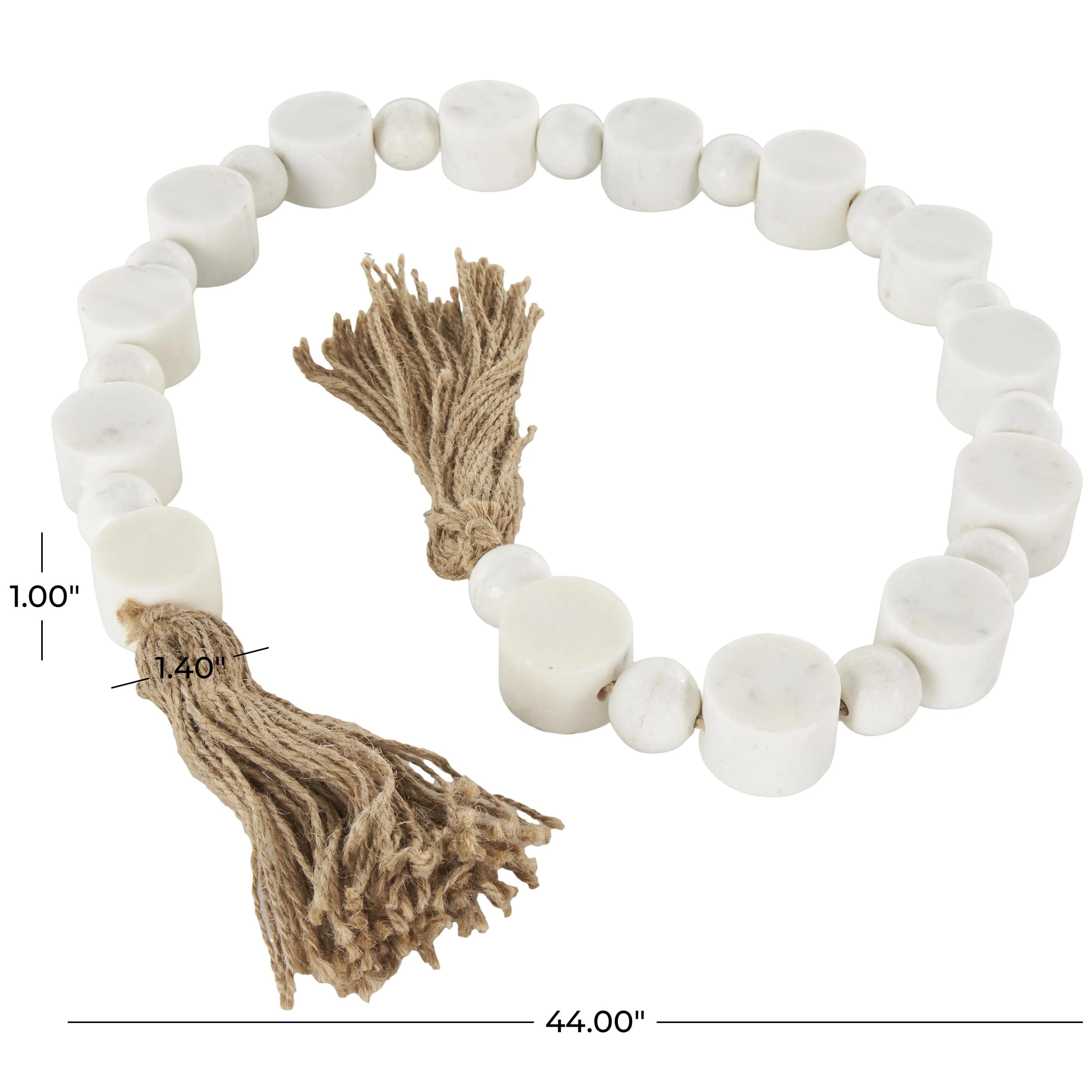- This white beaded garland with tassel is crafted from marble and jute rope for an elegant and long-lasting design
