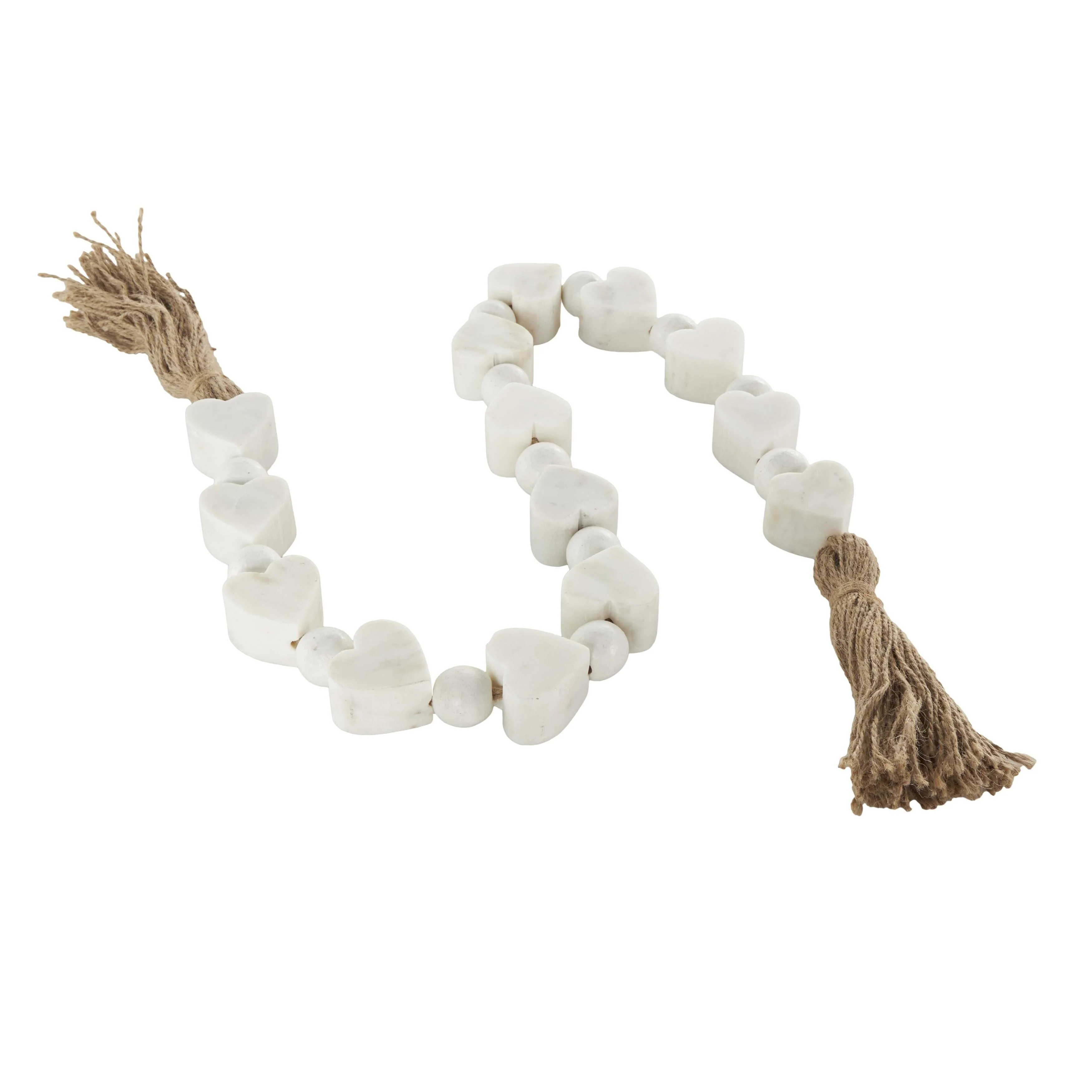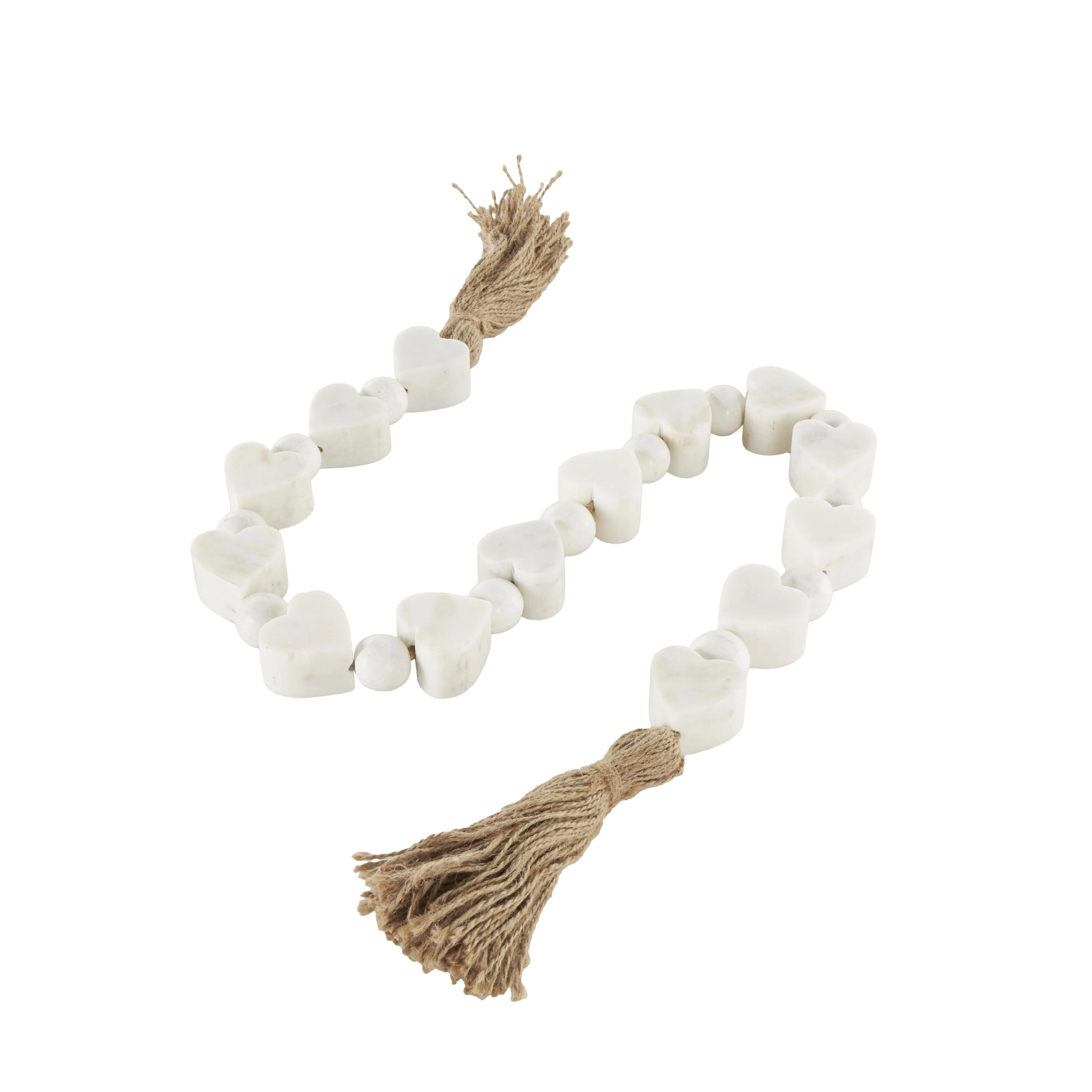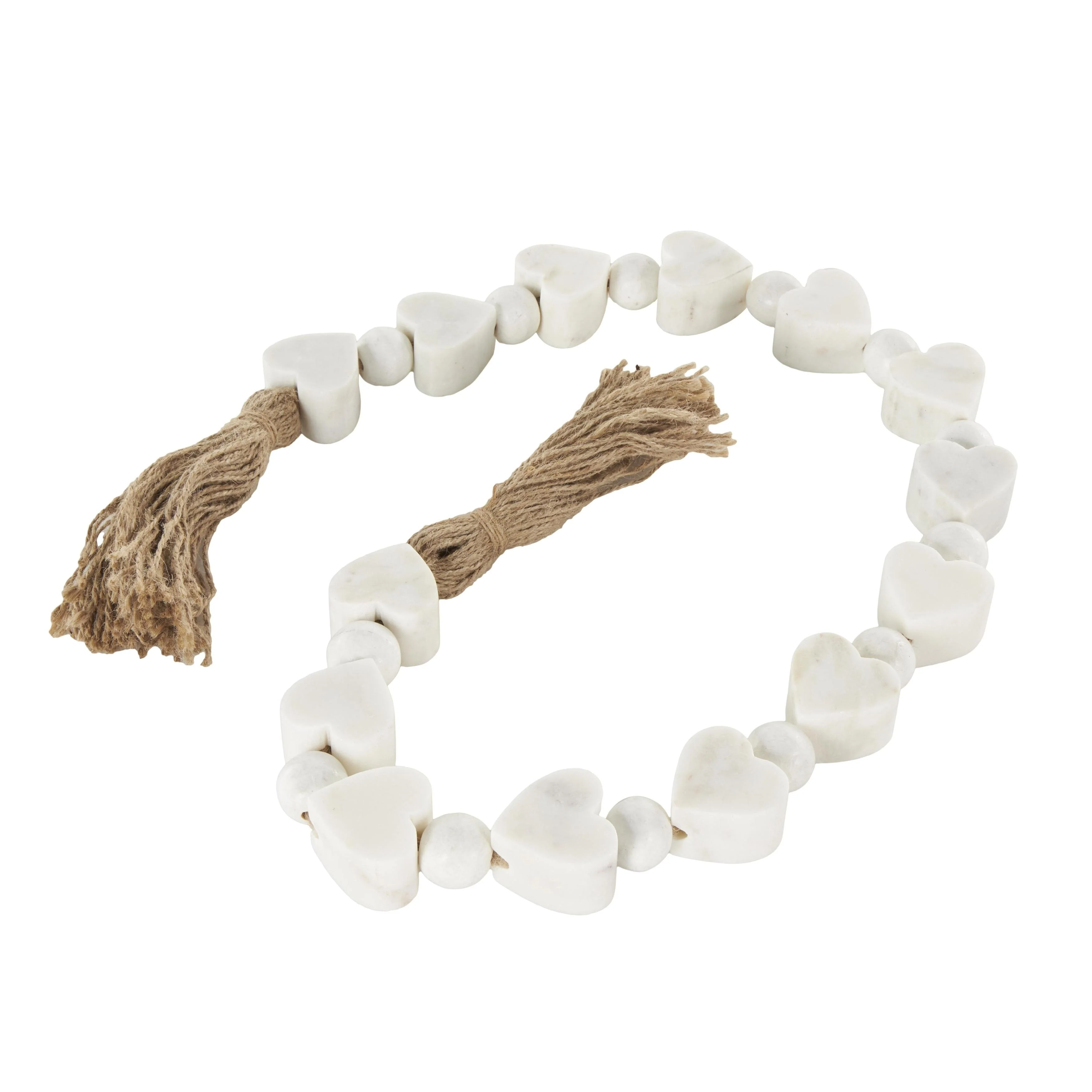 - This white beaded garland with tassel is crafted from marble and jute rope for an elegant and long-lasting design