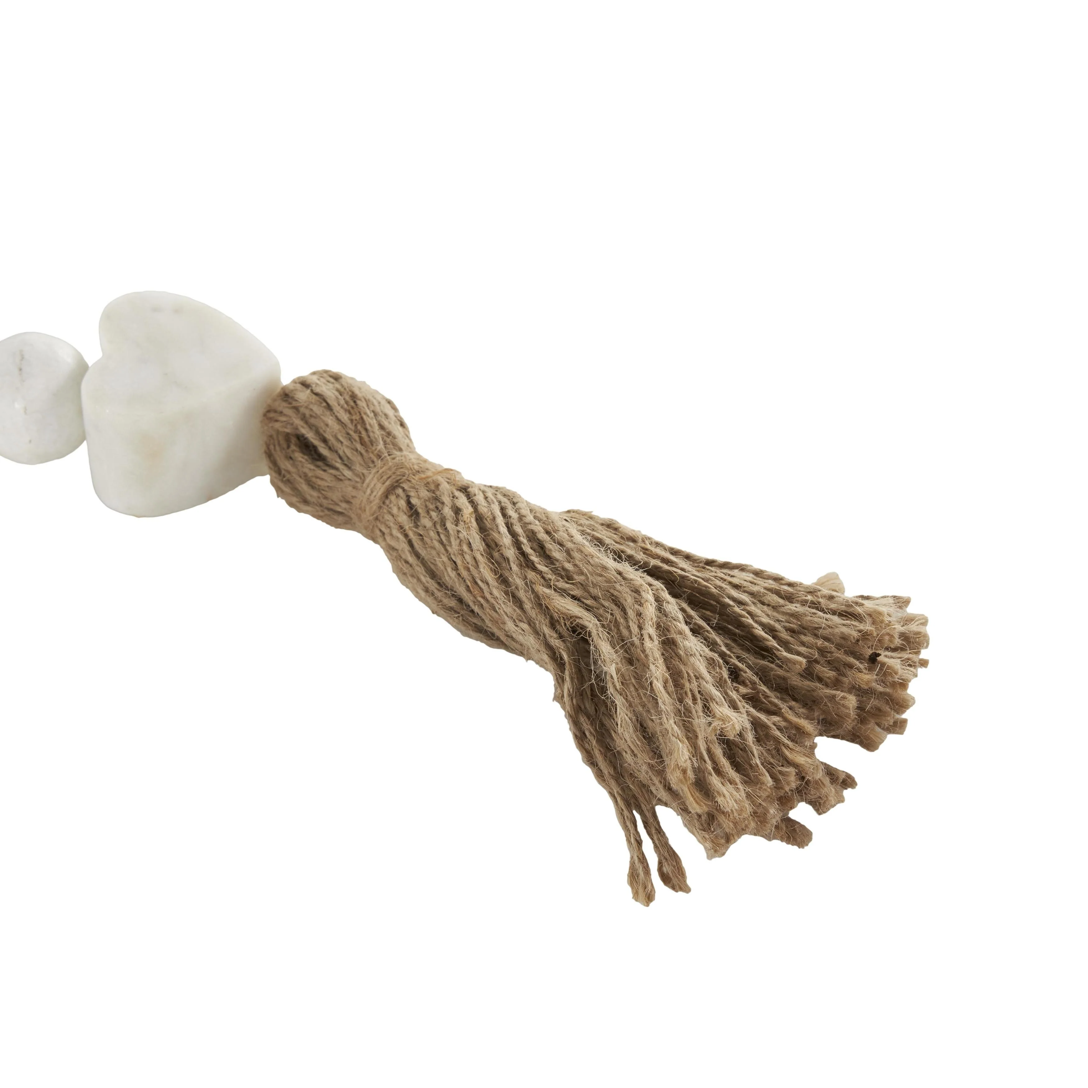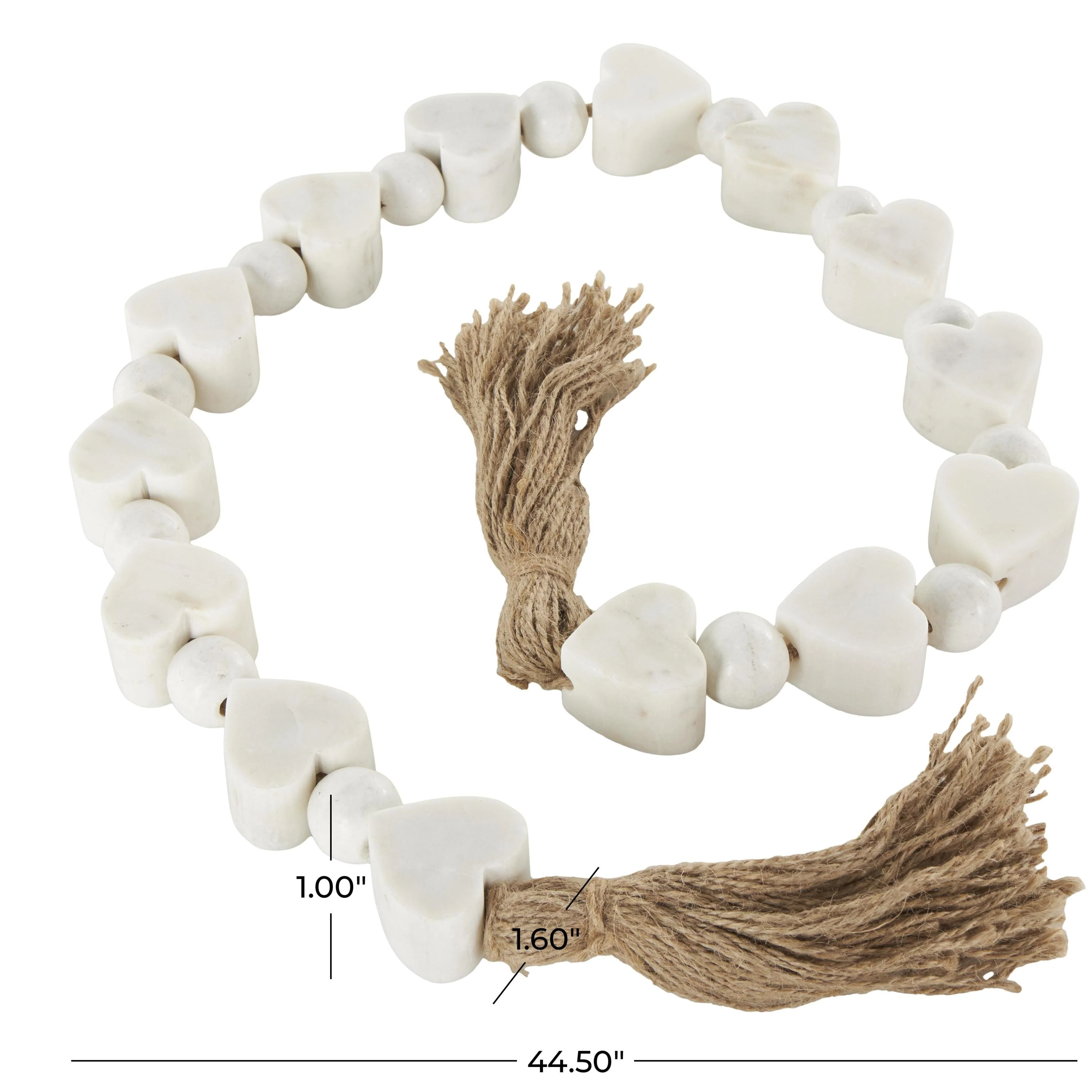 - The heart bead tassel garland boasts a matte white finish with a brown jute rope, exuding a timeless aesthetic