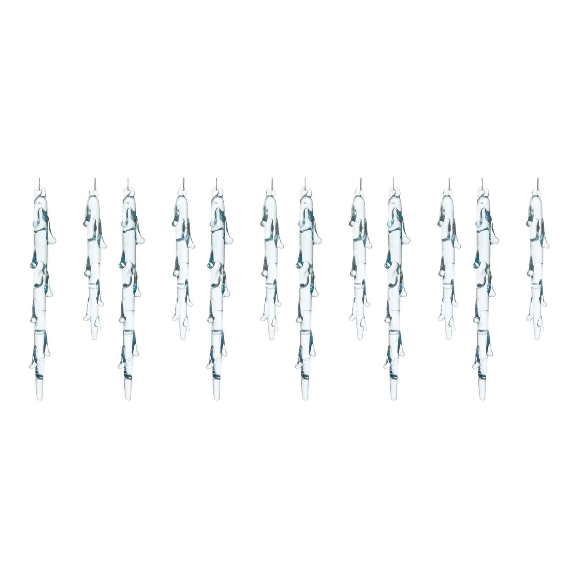 Elevate your holiday decor with our exquisite set of melted icicle ornaments. This 12-piece collection showcases wintry blue tones, adorned with a captivating icicle design. Each hangs gracefully from a delicate silver string, promising lasting joy for seasons to come. Add a touch of elegance to your Christmas tree and holiday decorations.