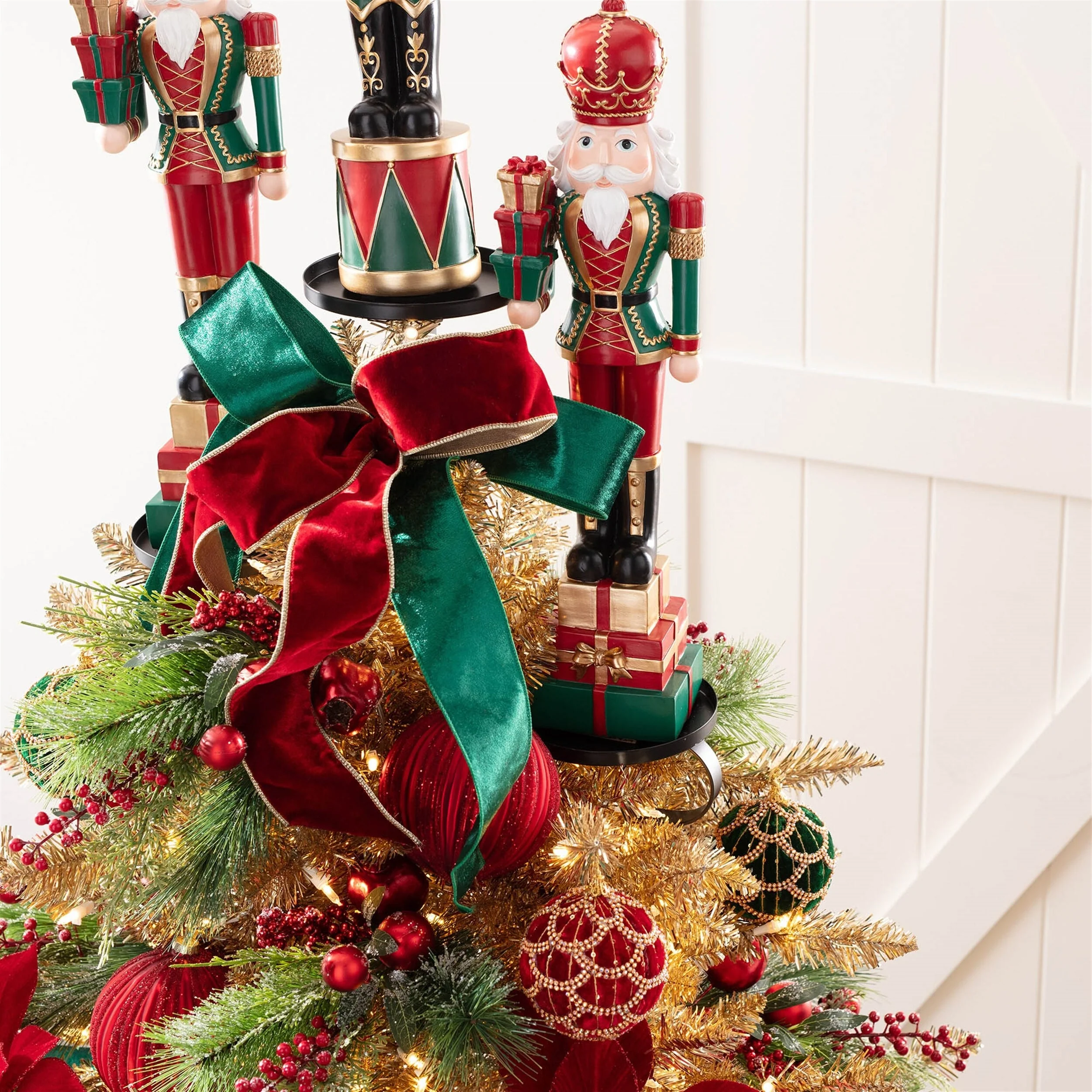 Elevate your Christmas tree with this Metal Triple Tree Topper Platform in classic black. Designed to seamlessly blend with your green pine tree, this versatile 36" tall platform features three tiers for a unique and customizable display. Secure it easily with a zip tie, ensuring the platforms stick out slightly at the top. Perfect for showcasing holiday figurines, arrangements, or statement pieces, this topper adds a personalized and festive touch to your tree this holiday season.