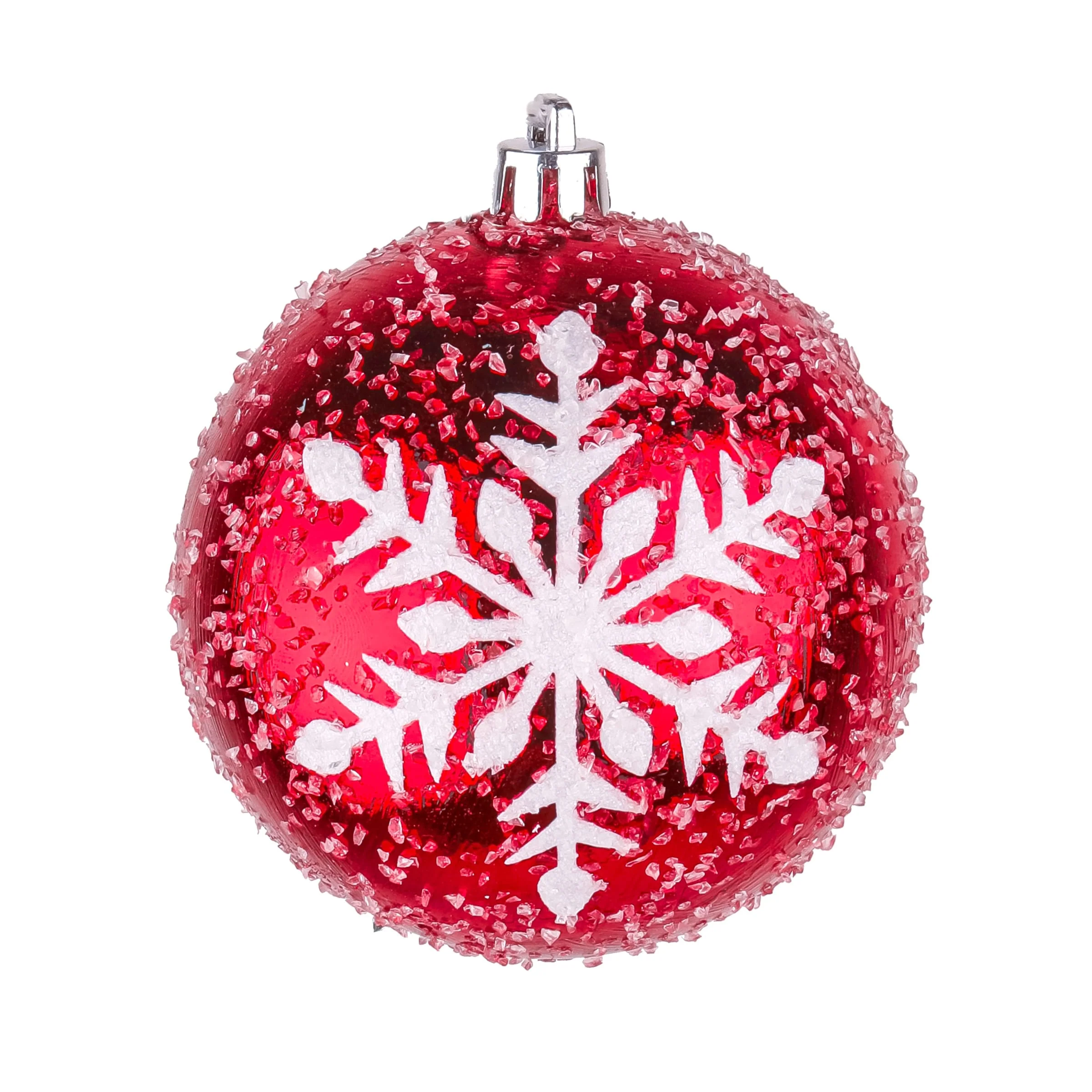 This set consists of six ball ornaments, three red and three white, that feature a large, stylized snowflake design. All are constructed of lightweight and shatterproof polystyrene material. Each ball is sprinkled with snow and includes a hanging loop. Add some traditional colors to your Christmas tree decorating with these fun holiday ornaments.