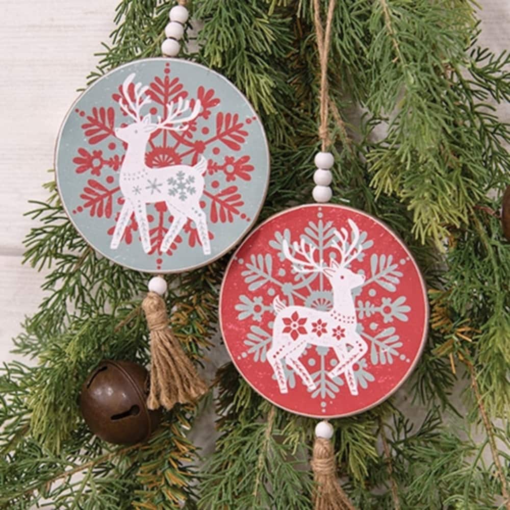 - One green ornament with a red snowflake and a white snowflake-patterned reindeer.