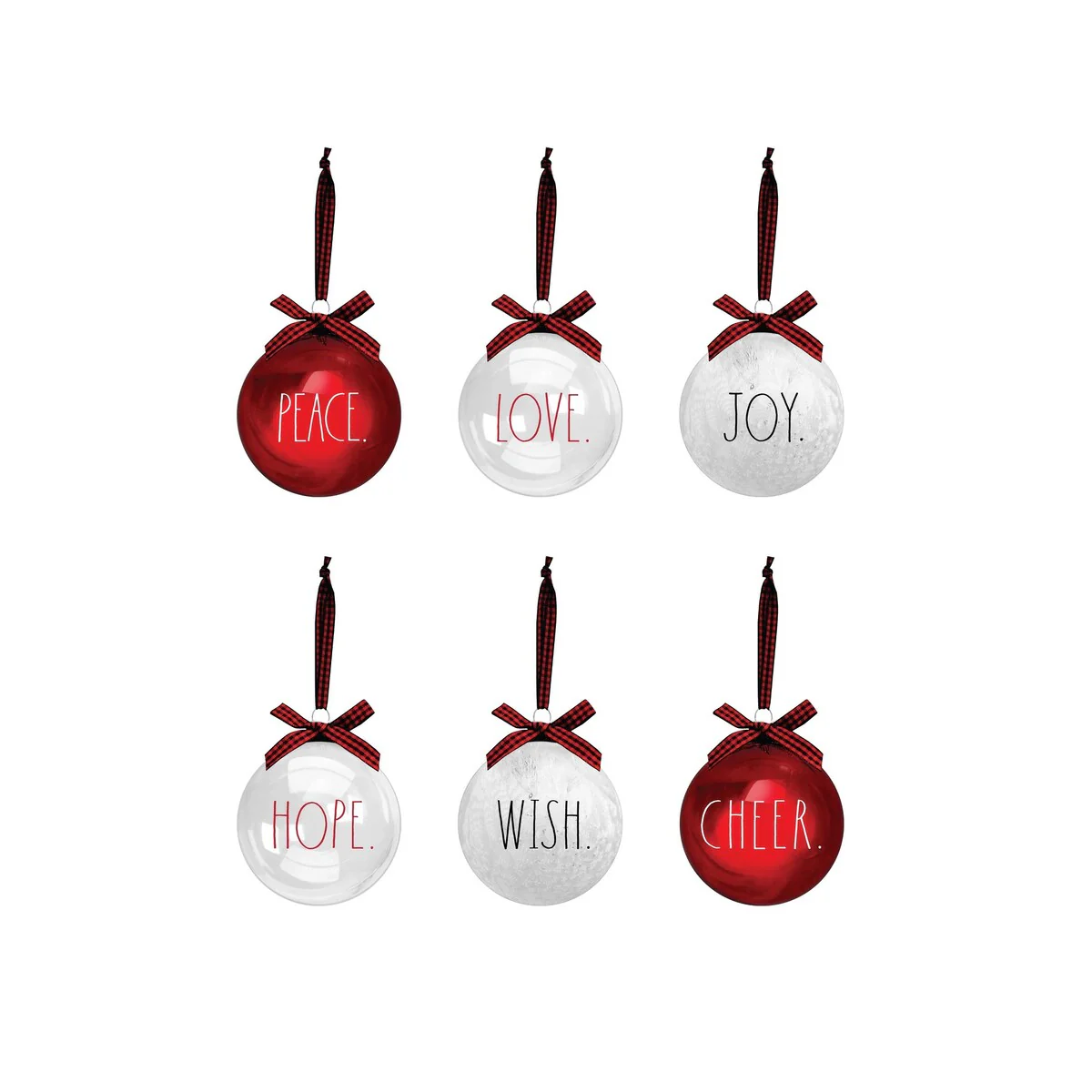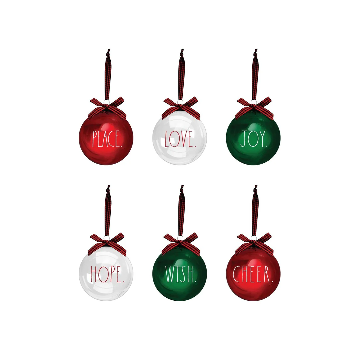 Decorate trees and spread the holiday cheer with this gorgeous Set of 6 Glass Christmas Ornaments by Rae Dunn! These beautiful glass ornaments feature words of Peace, Love and Joy in Rae Dunn’s signature font. Upgrade last year’s decorations with stunning new ornaments nice enough for Santa himself.