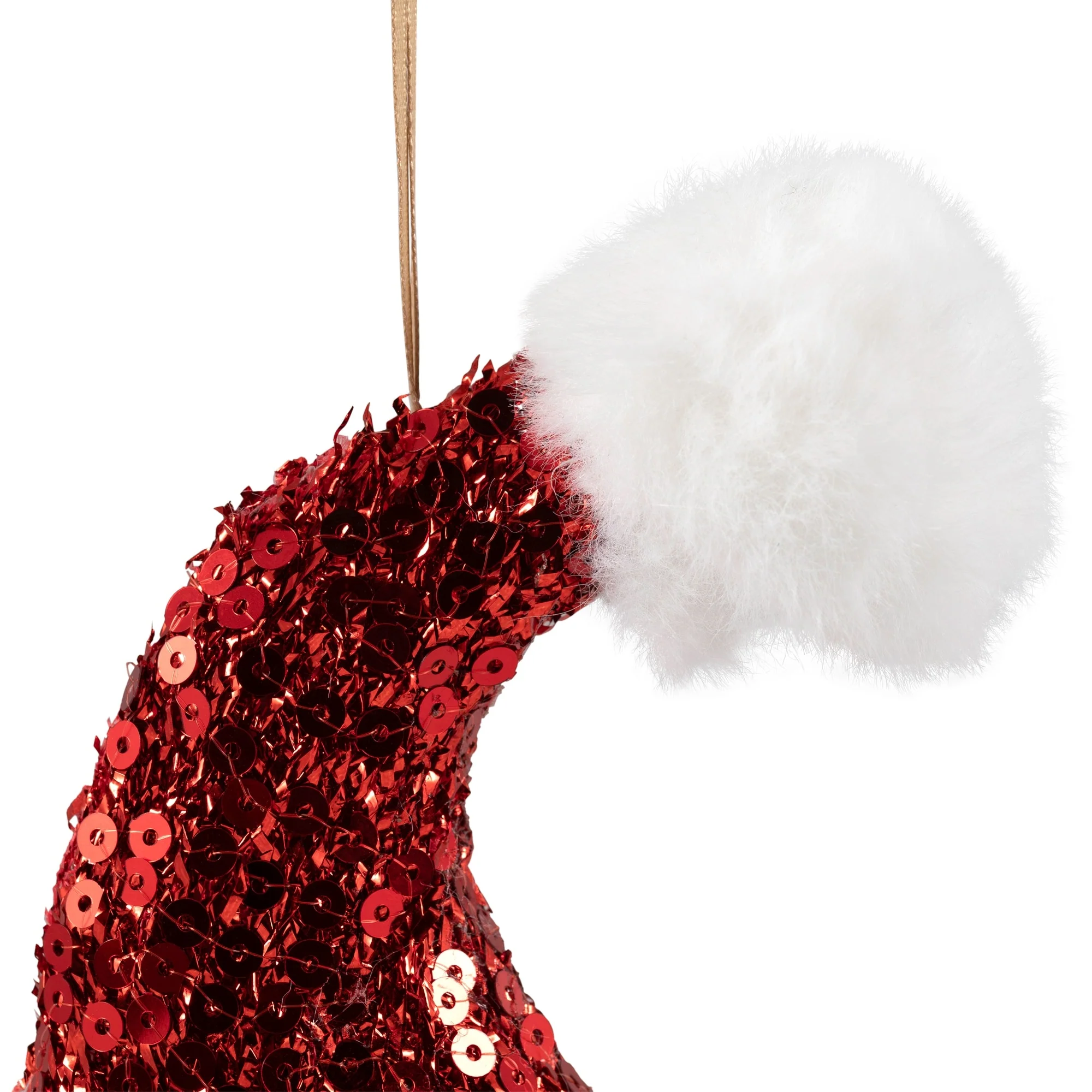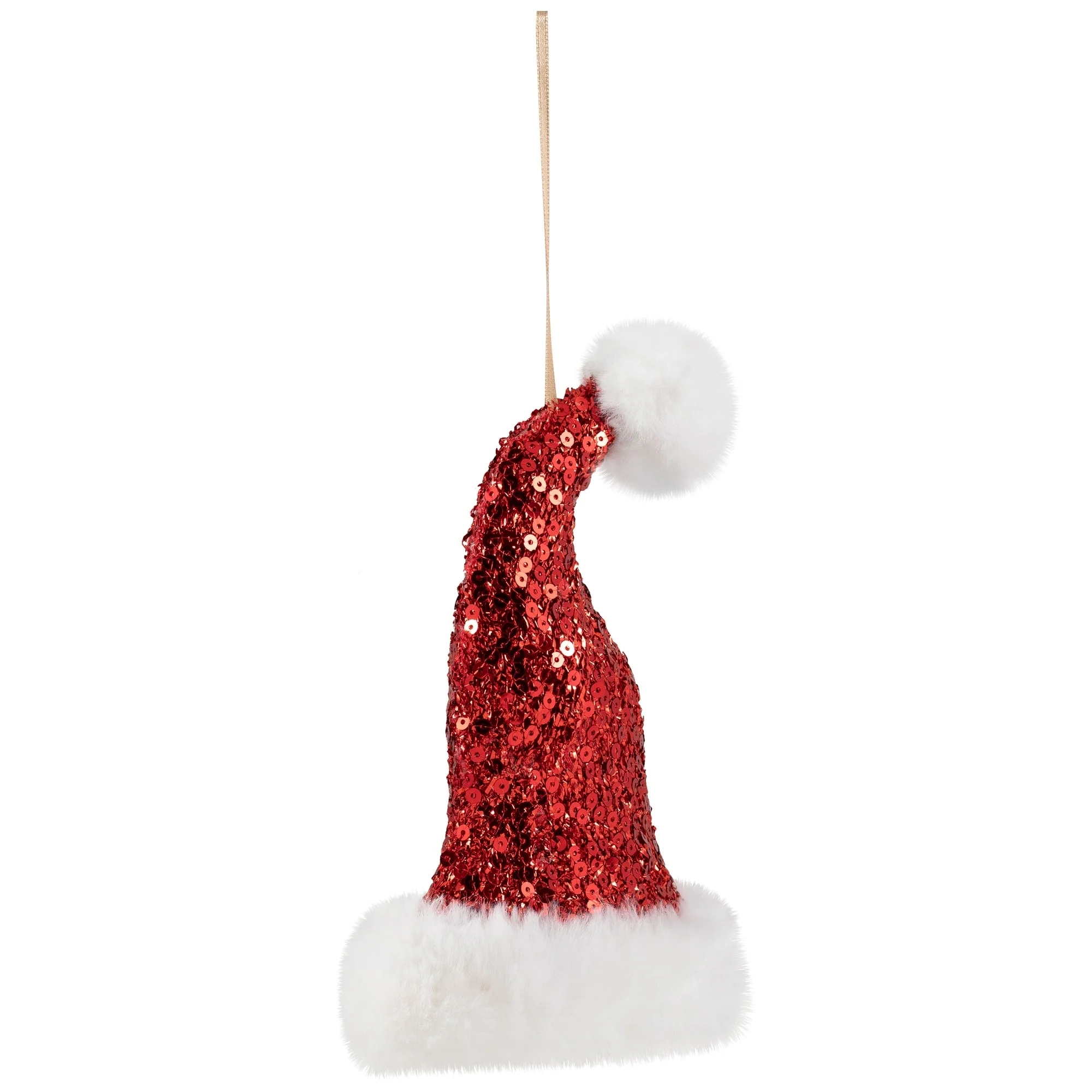 Elevate your seasonal displays with this elegant ornament, ideal for adding a dash of sparkle to your home this holiday season. This stunning ornament features a classic red and white Santa hat design, adorned with shimmering red sequins and plush white trim. Its double-sided construction ensures it looks perfect from any angle, while the attached white ribbon makes it easy to hang on your Christmas tree, wreath, or anywhere you desire.