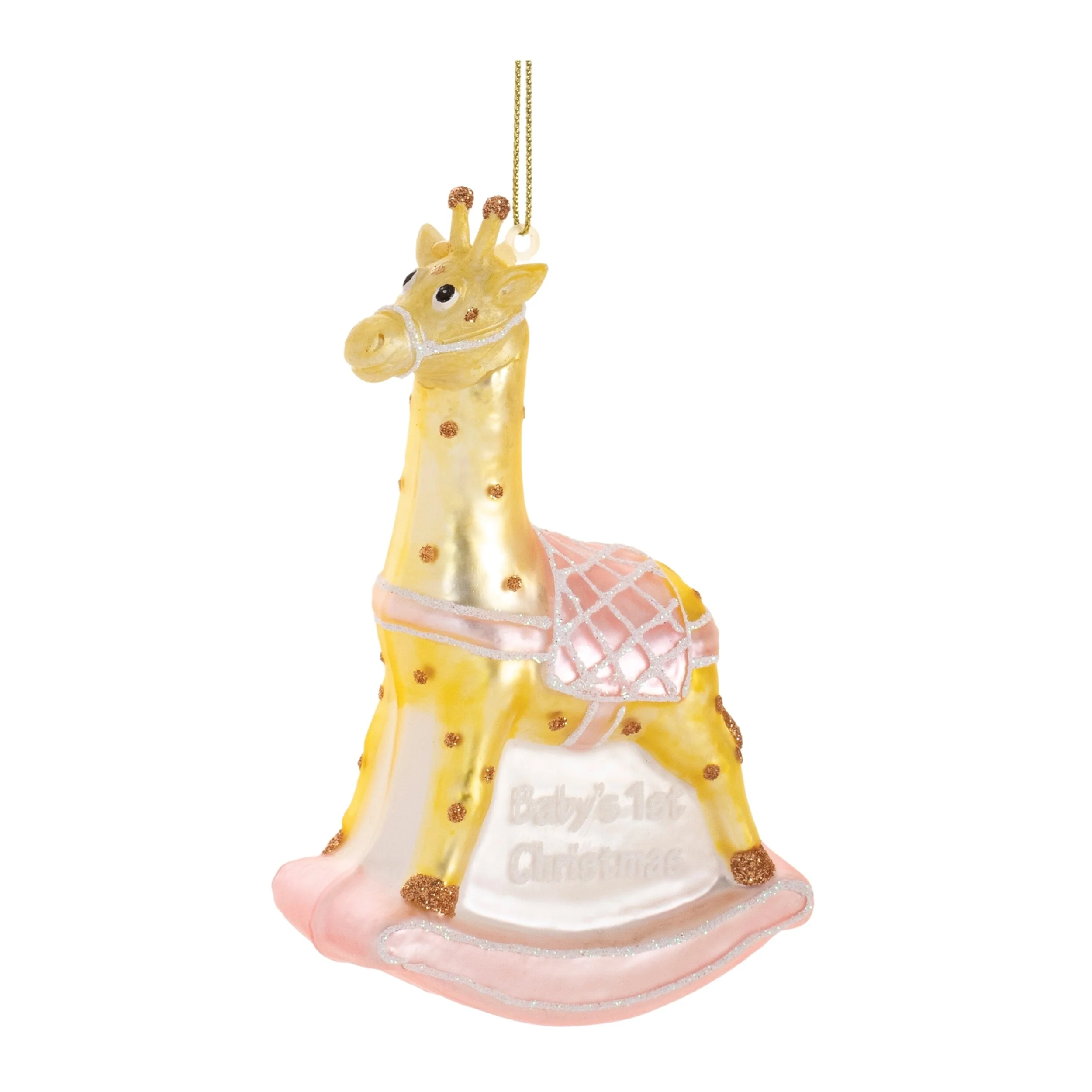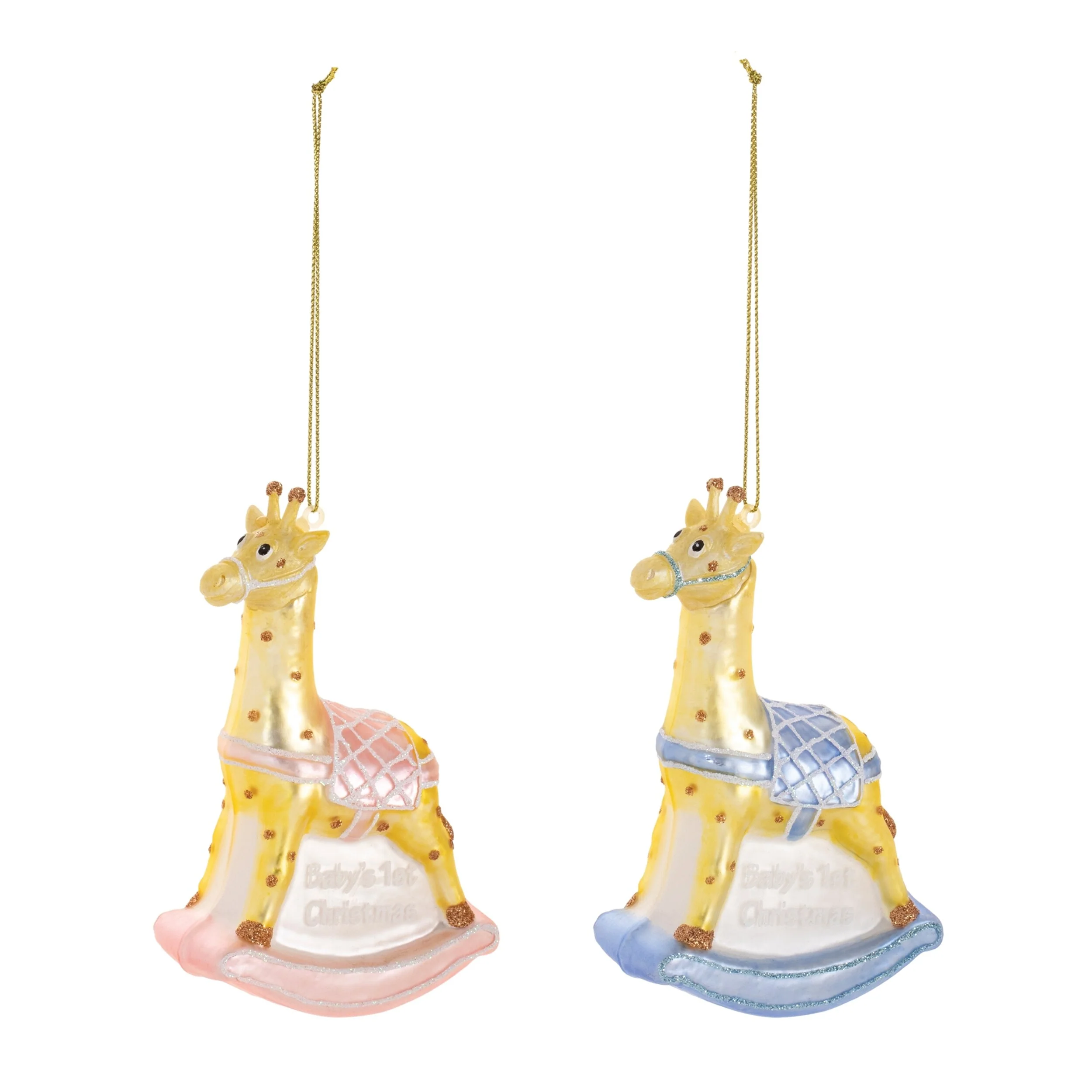 Welcome the holiday season with a heartwarming touch using this set of 12 baby's first Christmas ornaments, thoughtfully crafted from glass and polyresin. Showcasing a delightful giraffe rocking horse design in soft pink, blue, and beige hues, each ornament is detailed with shimmering glitter accents and the touching message “Baby’s 1st Christmas.” Designed to be both meaningful and decorative, these keepsake ornaments are perfect for celebrating a newborn’s first holiday and make a thoughtful gift for new parents. Each ornament comes with a convenient hanging loop, making it easy to display on Christmas trees, garlands, or nursery shelves. Measuring 3.25”L x 1.5”W x 4.75”H and weighing 1.96 lbs, this set adds a joyful, festive charm to any indoor holiday décor.