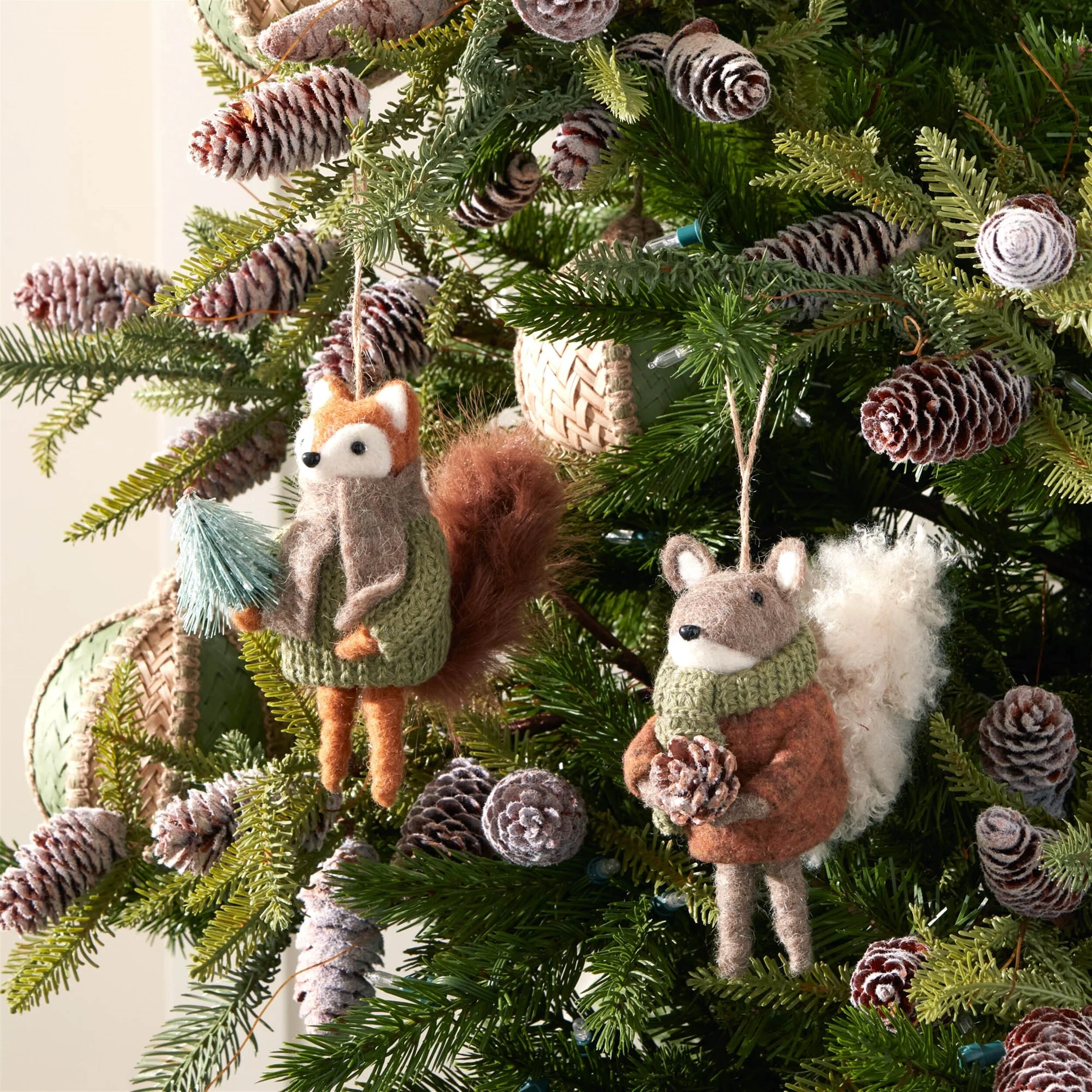 Bring woodland charm to your holiday display with this 12-piece set of felt Squirrel Ornaments. Each 6-inch ornament is crafted from soft polyester in cozy green and brown hues, accented with subtle glitter for a festive sparkle. Featuring playful woodland characters dressed in winter sweaters and scarves, these ornaments are adorned with pinecone and pine tree details for added seasonal flair. Complete with rustic jute string hangers, they are ideal for hanging on Christmas trees, garlands, or wreaths. Perfect for creating a warm, woodland-inspired holiday atmosphere indoors.