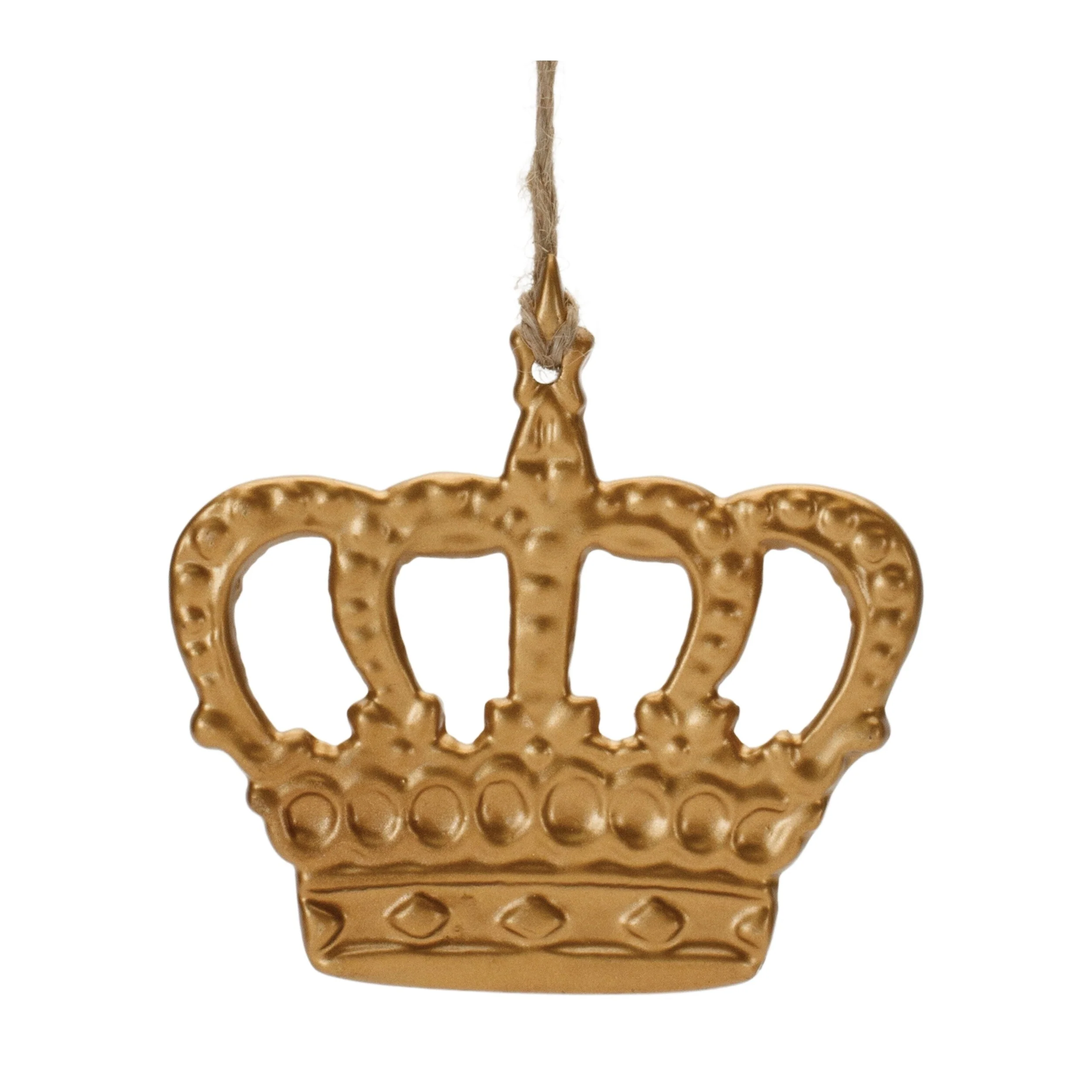 Elevate your holiday décor with the Gold Metal Crown Ornament Set. This stunning set includes 12 pieces of royal crown-shaped ornaments, each featuring two different designs for a touch of variety. Crafted from durable aluminum, these ornaments boast an elegant gold finish that adds sophistication and charm to any Christmas tree. Each ornament is equipped with a delicate jute string hanger for easy display. Measuring 3.5 x 0.25 x 3" and 3.75 x 0.25 x 3", this set of crown-shaped ornaments will bring a regal flair to your festive decorations. Perfect for adding a festive touch to your home or as a thoughtful gift for loved ones, these ornaments are designed for indoor use only, making them ideal for a variety of holiday settings.