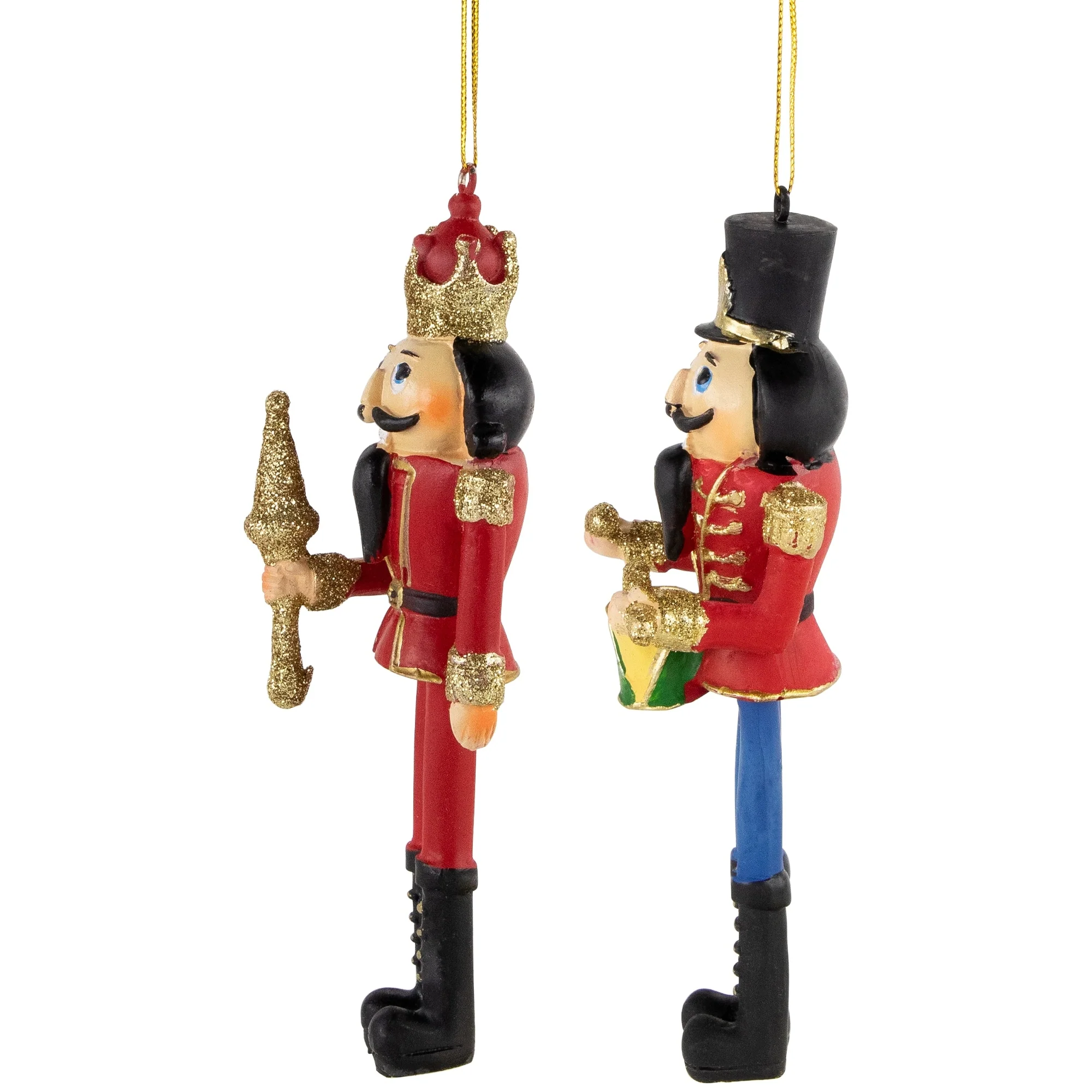 Folklore says that nutcrackers help to protect your family and bring good luck to your home. Give yourself extra good luck with this set of nutcracker ornaments. The set features a King with his crown and septor and a soldier with his drum. These ornaments will be the perfect addition to your tree, mantle, window, or anywhere you wish to add a little bit of holiday charm.