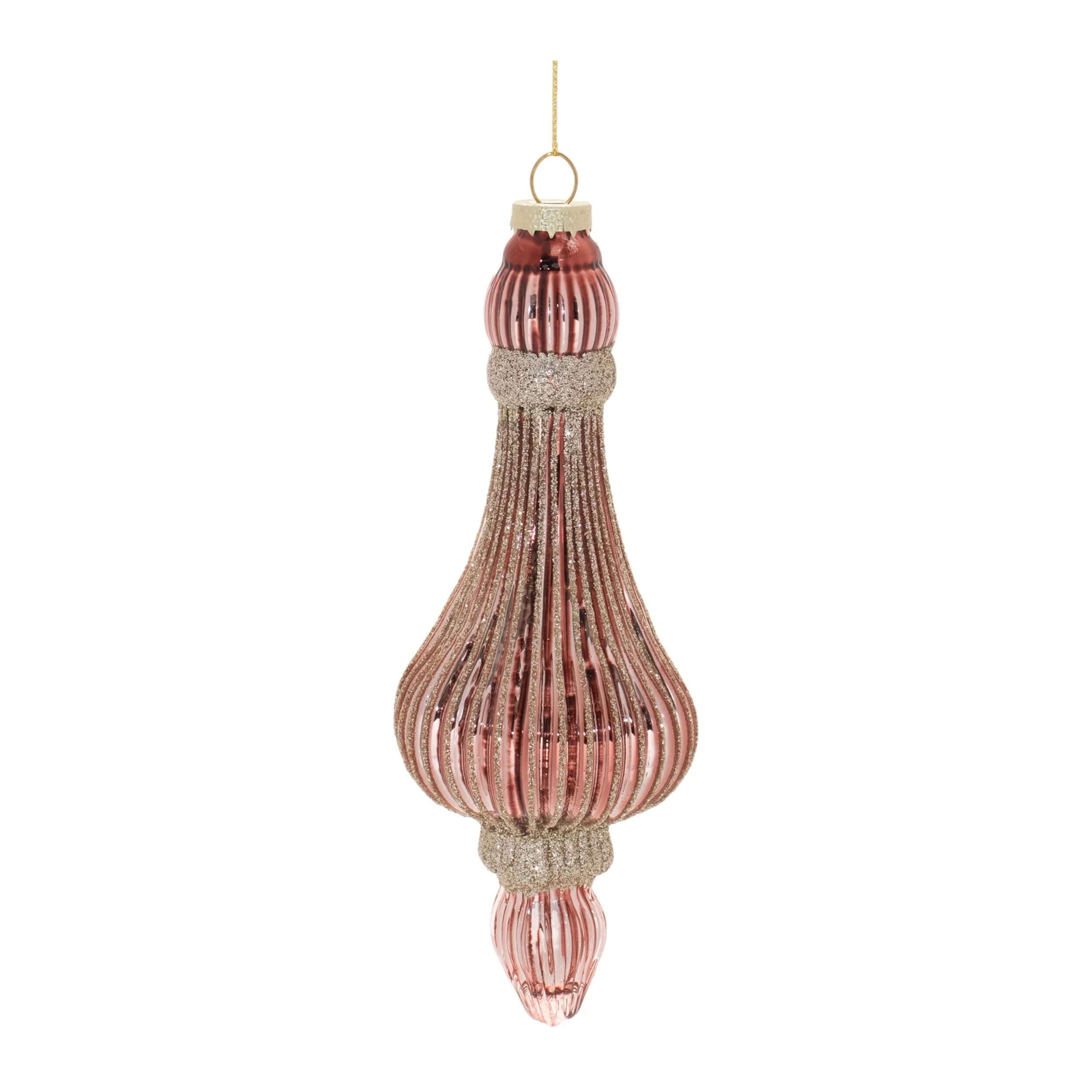 Elevate your holiday décor with this set of six ribbed glass drop ornaments in a luxurious gold tone, measuring 2”L x 2”W x 7.75”H and weighing 1.29 lbs each. These beautifully crafted ornaments showcase a modern drop shape with a ribbed texture that reflects light for an eye-catching effect, enhanced by soft pink and mauve hues accented with delicate glitter details. Each ornament features a gold-tone cap and a delicate string hanger, making them easy to display on Christmas trees, wreaths, or garlands. This assorted set of three unique designs brings a stylish and festive ambiance to any indoor setting, perfect for seasonal decorating or gifting during the holidays.