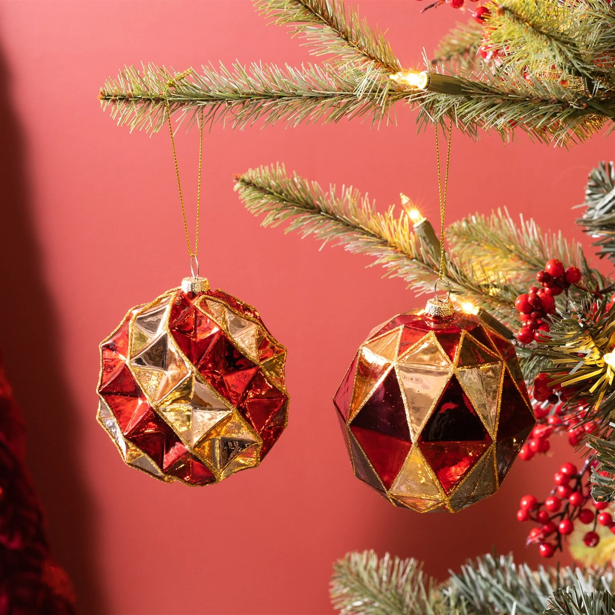 Add a festive touch to your holiday decor with this set of 6 glass Christmas ornaments. Designed in classic red and gold with two stylish patterns, each ornament features glitter accents and a harlequin motif for a timeless look. The assortment includes two styles in varied sizes, each crafted from glass with a pre-attached string for easy hanging. These ornaments are perfect for filling in tree branches or adding charm to garlands, wreaths, or tabletop displays. Ideal for indoor use, this set is a great way to refresh your seasonal collection or offer as a thoughtful holiday gift.