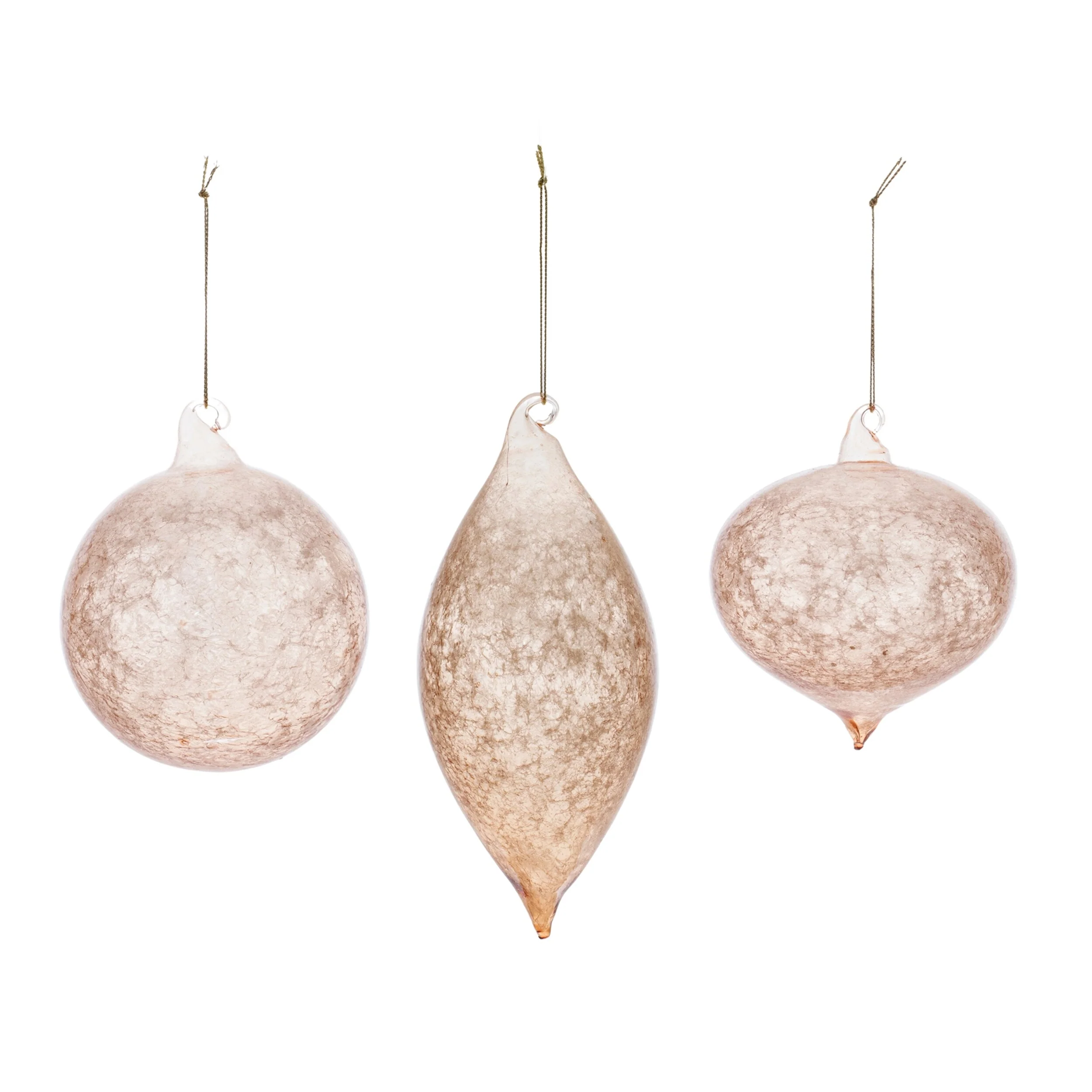 Elevate your holiday decor with this exquisite set of Crackle Glass Ornaments. Perfect for adorning your Christmas tree, this set includes six beautifully crafted pieces in three distinct designs, each measuring 5"H, 5"H, and 7"H. The soft gold and blush tones, combined with the classic ornament shapes and swirled glass accents, create a timeless charm that enhances your festive display. Made from glass, each ornament features a delicate gold string hanger, ensuring lasting quality for many seasons of enjoyment. These ornaments are a perfect addition to your own holiday collection or make for a stylish gift to share the holiday cheer.