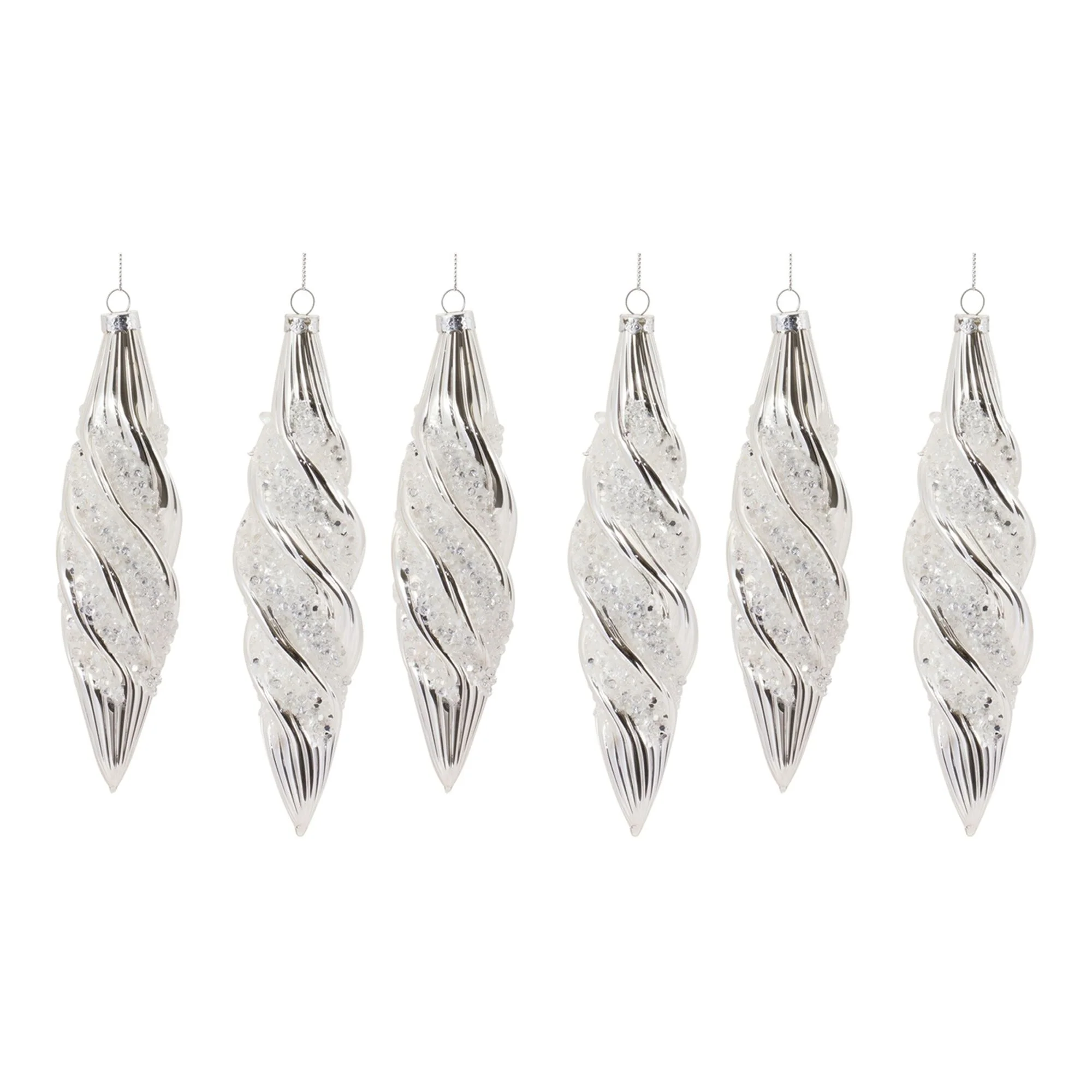 Elevate your holiday decor with our exquisite set of swirl ornaments. This 6-piece collection boasts a silver tone and is adorned with a captivating beaded design. Each hangs gracefully from a delicate silver string, promising lasting joy for seasons to come. Whether adorning your tree or gifted to loved ones, these ornaments will surely evoke smiles and add a touch of elegance to your Christmas celebrations.