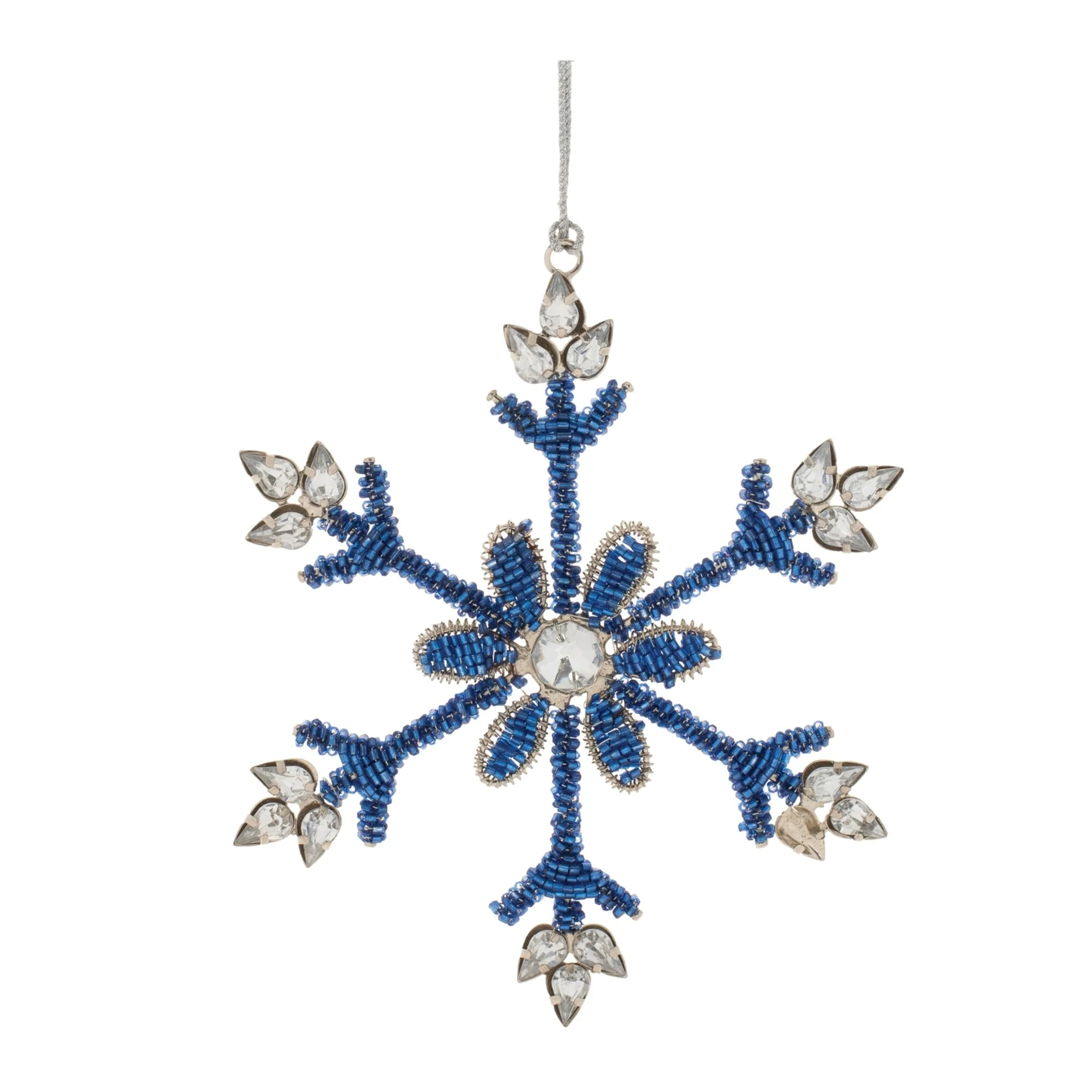 Elevate your holiday decor with the icy elegance of the beaded metal snowflake ornament. Crafted in shimmering blue and silver tones, each ornament features a classic snowflake silhouette embellished with intricate glass beadwork. The slim iron frame adds a delicate structure while the included string hanger makes for effortless tree styling. With two assorted designs, these ornaments bring a sophisticated sparkle to Christmas trees, wreaths, or festive displays.