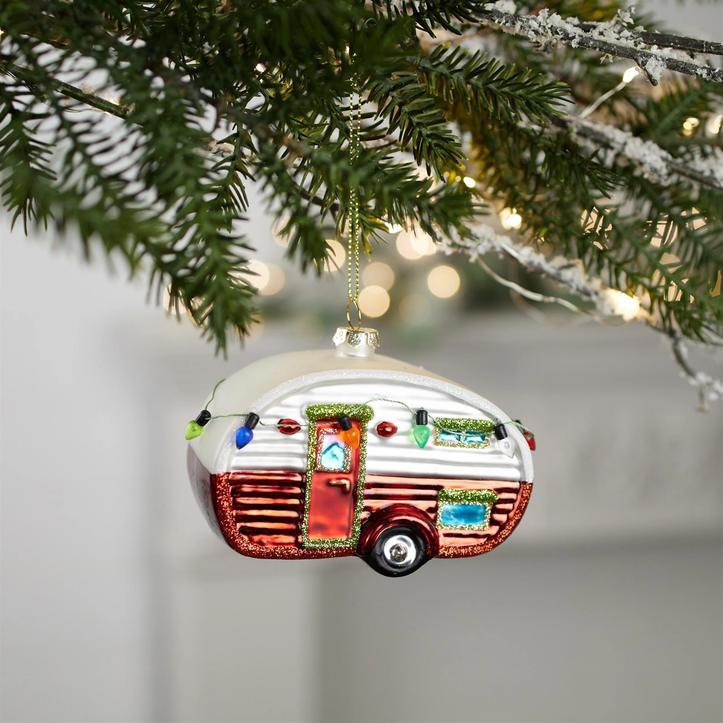 Set of 12 Red and White Glass Camper Ornaments with Festive Glitter Details for Holiday Decorating - 4”L x 2”W x 3”H