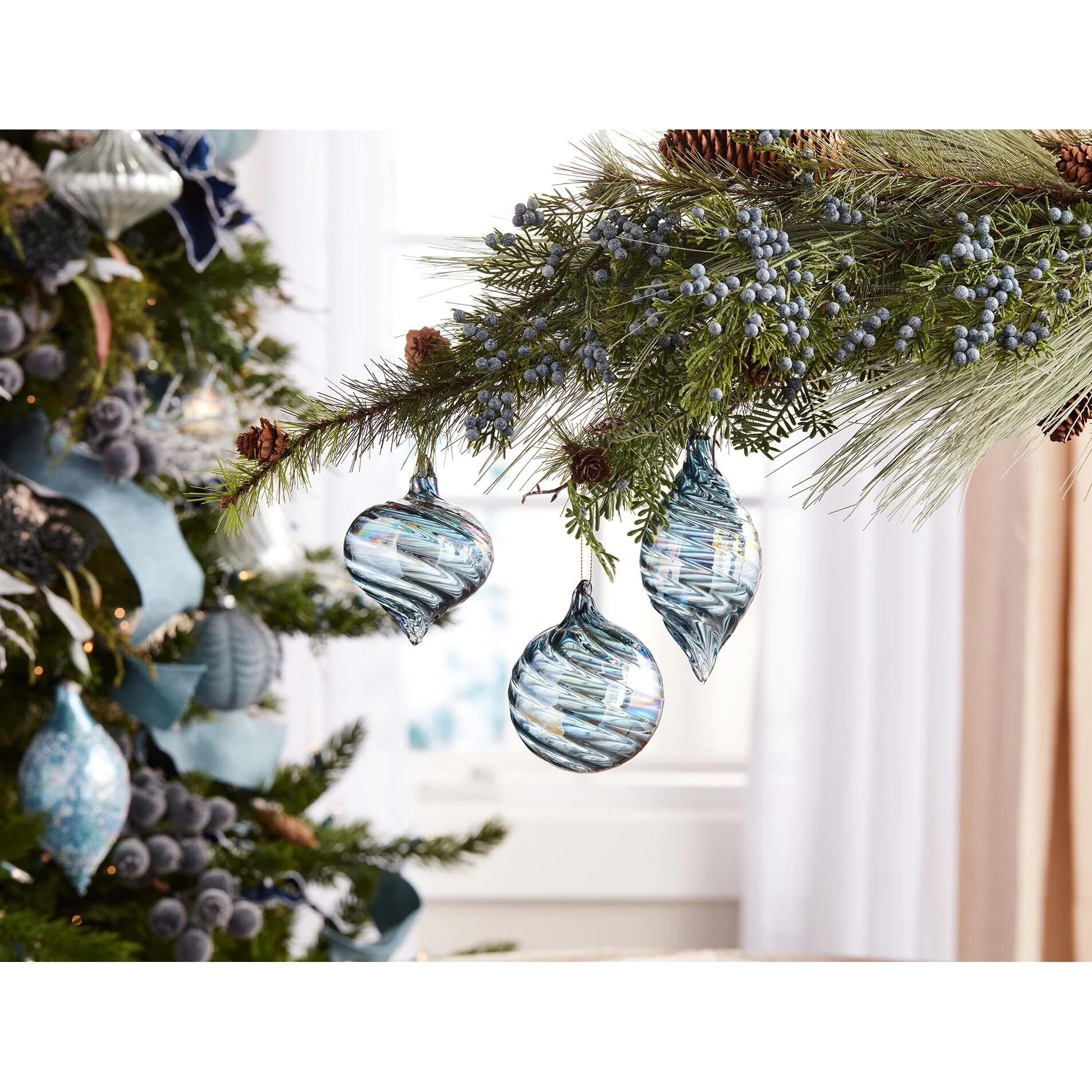 Blue Glass Iridescent Swirl Ornaments Set of 12 Ball and Onion Holiday Decor - 3” x 3” x 3.75” (L x W x H)