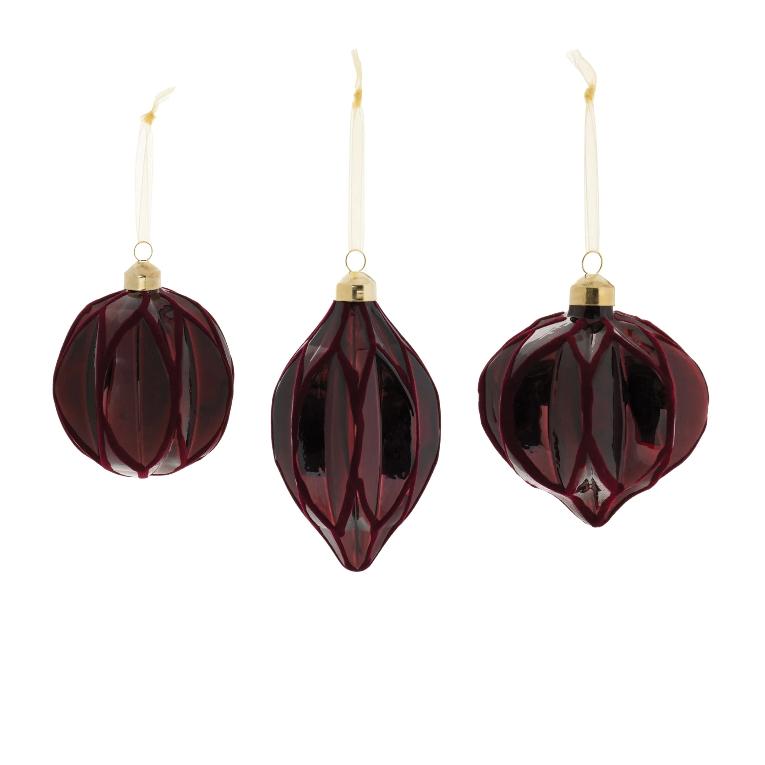 Set of 6 Red Velvet Glass Christmas Ornaments Ribbed Ball Onion Drop Shapes for Tree Decor - 3.5”L x 3.5”W x 4”H