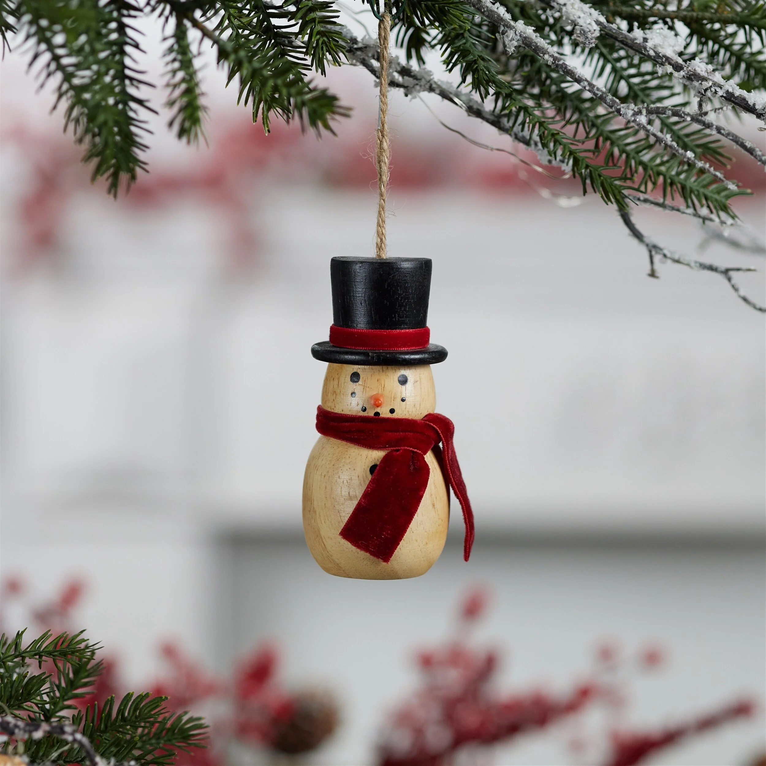 Set of 12 Wooden Snowman Jute String Ornaments with Fabric Scarf and Hat for Rustic Christmas Tree Decor - 2”L x 2”W x 4”H