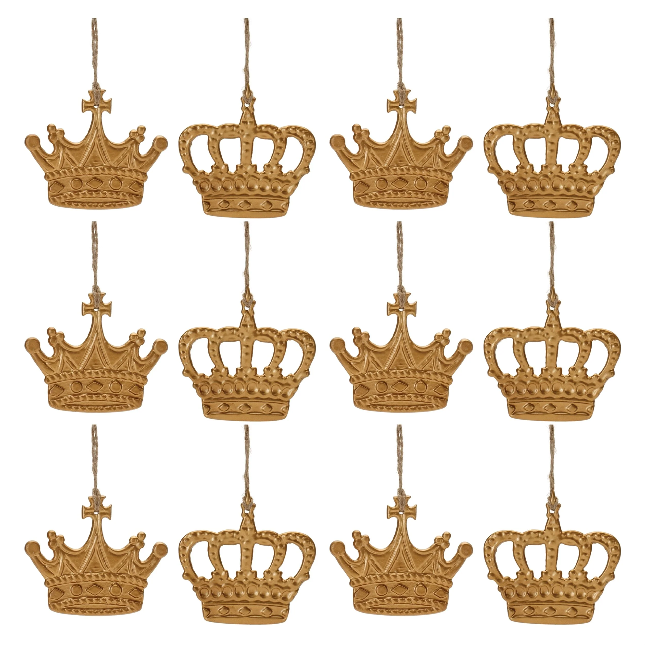 Set of 12 Gold Metal Crown Ornaments for Christmas Tree Holiday Decor - 3.5” x 0.25” x 3.5”