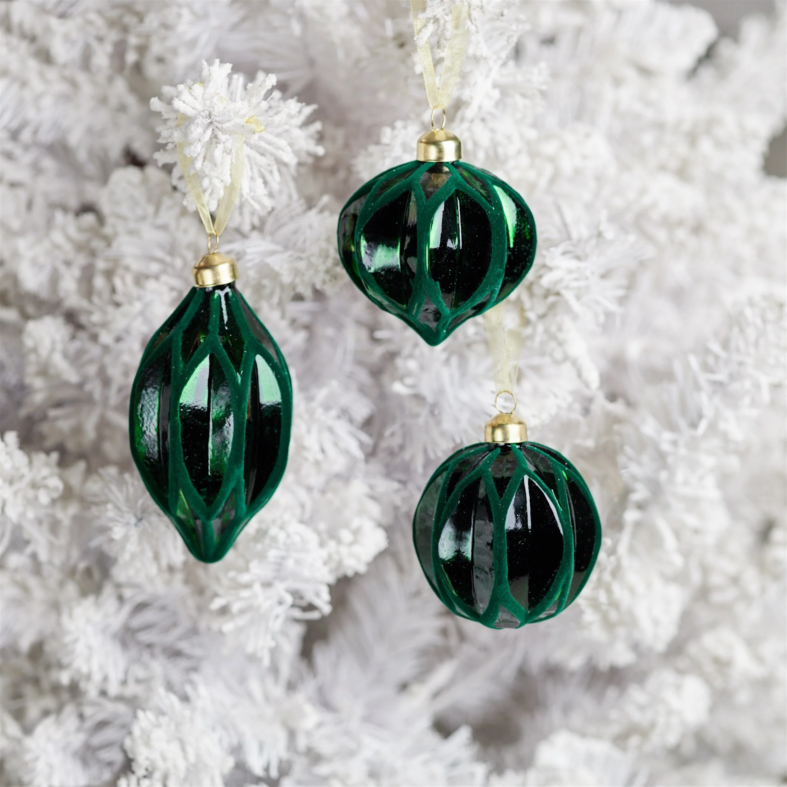 Green Velvet Glass Ribbed Ornaments Set of 12 Ball Onion Oblong Decor - 3” x 3” x 3.5” (L x W x H)