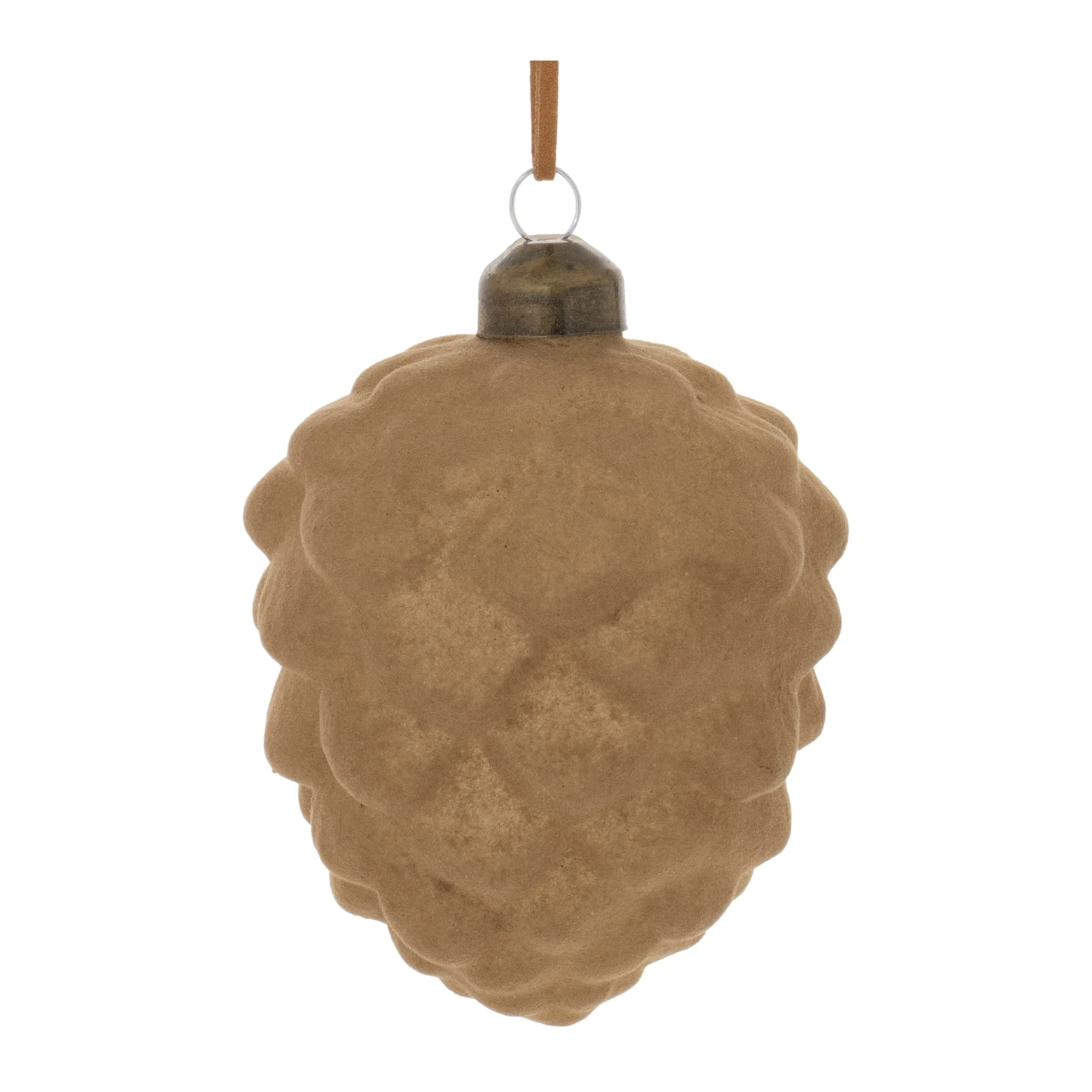 Brown Flocked Glass Pinecone Ornaments with Leather Cord Set of 12 Rustic Decor - 2.75” x 2.75” x 3.75” (L x W x H)