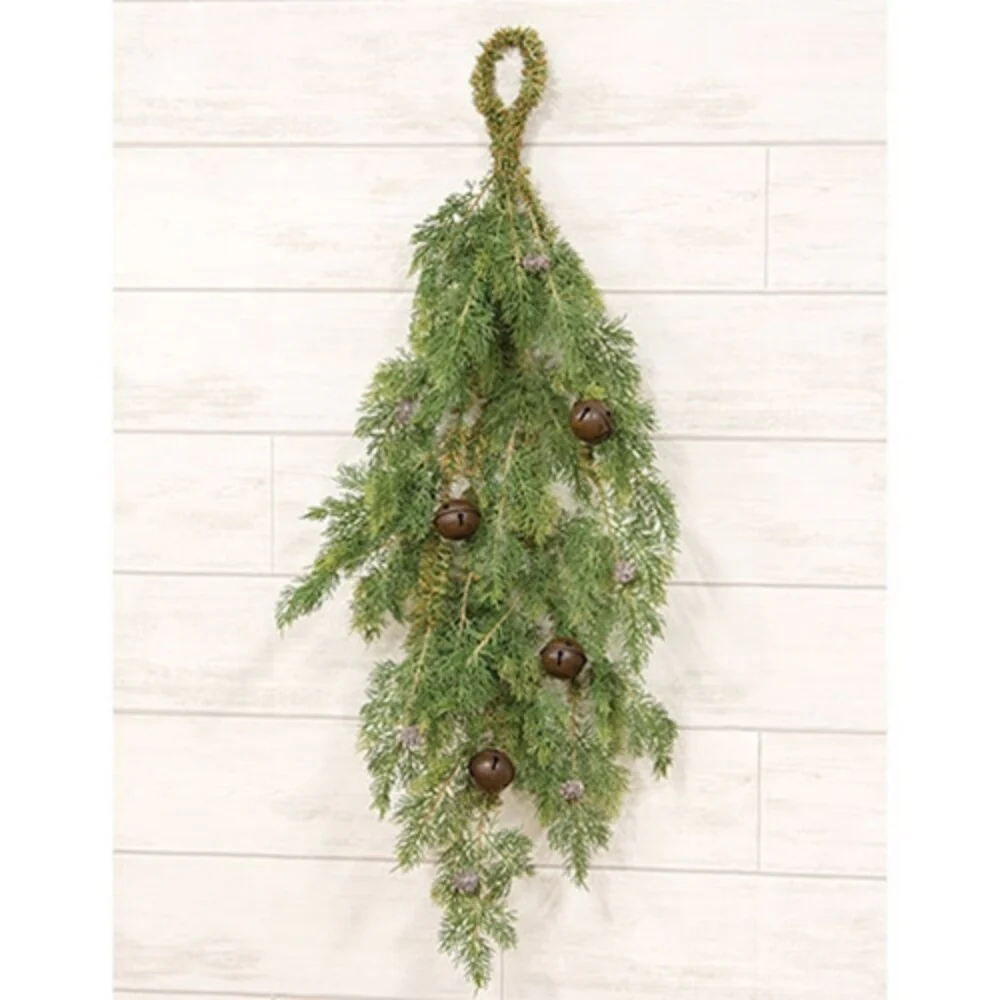 Green-Brown Cedar Teardrop Wreath with Jingle Bell, Pinecone Accents and Loop Hanger - 14" L x 3" W x 30” H