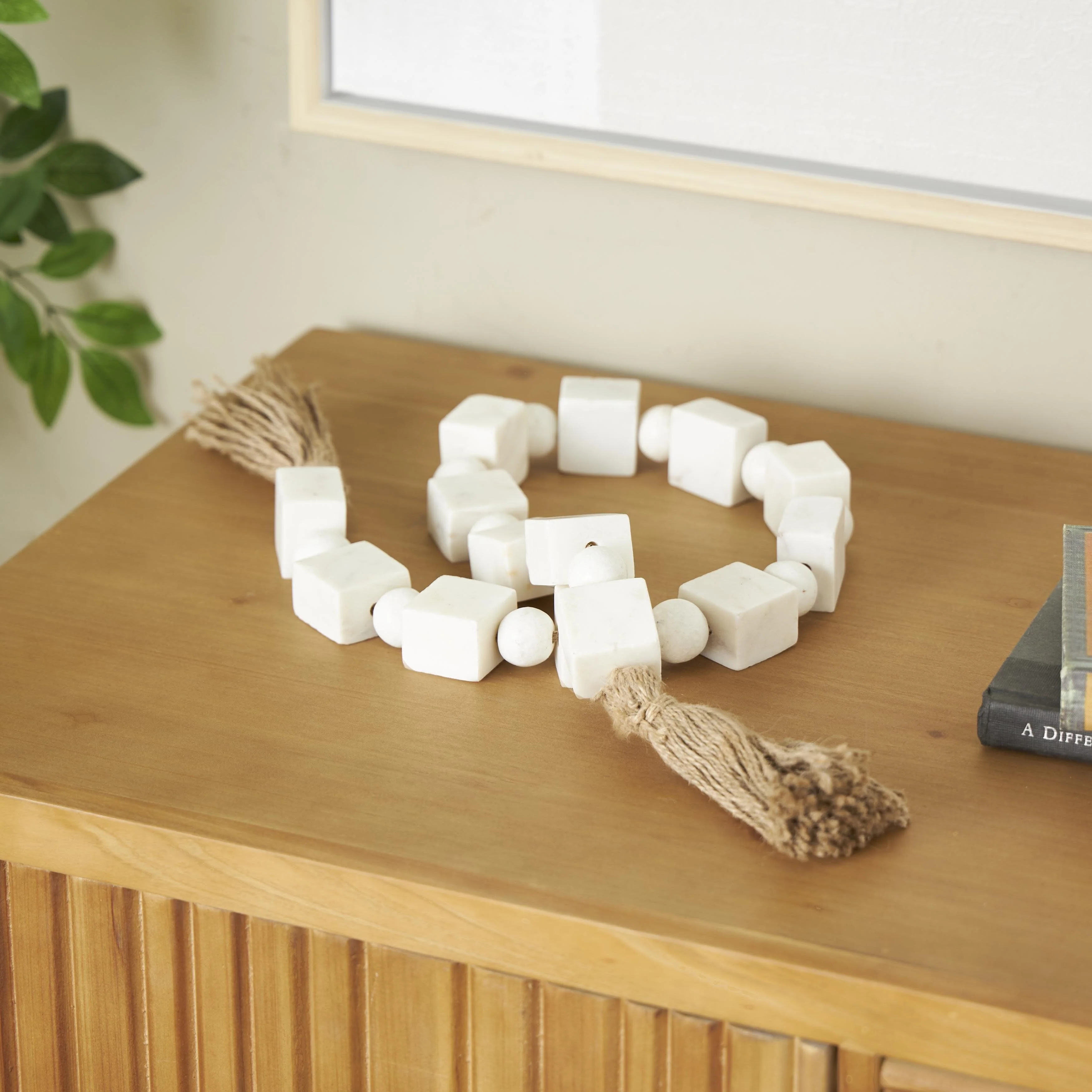 Marble Handmade Square Beaded Garland with Tassel with Knotted Brown Jute - White - Roche River Decor - 2"W x 42"L x 1"H