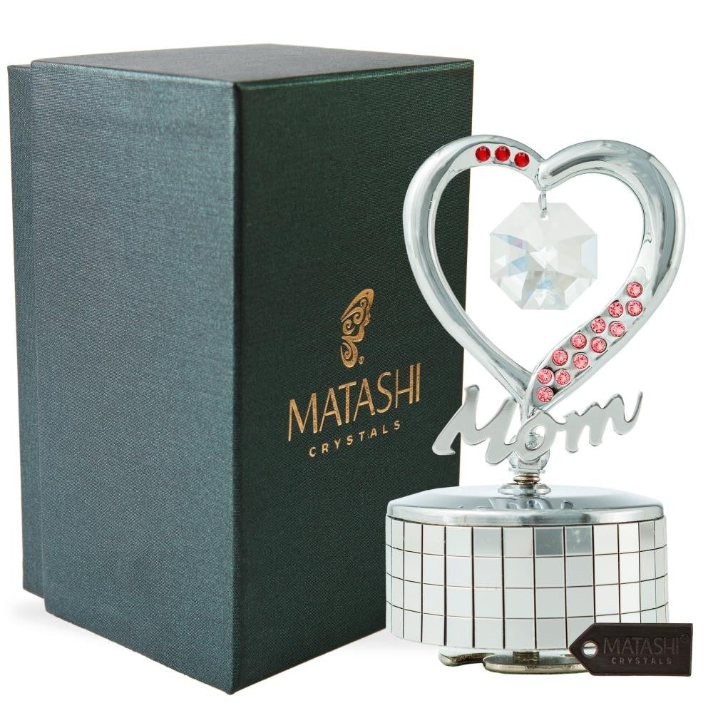 Mom Heart Wind-Up Music Box Table Top Ornament with Crystals by Matashi (Choose Gold or Silver)