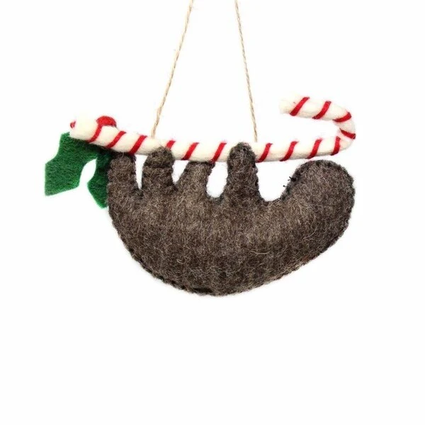 Handmade Felted Wool Christmas Ornament, Candy Cane Sloth-