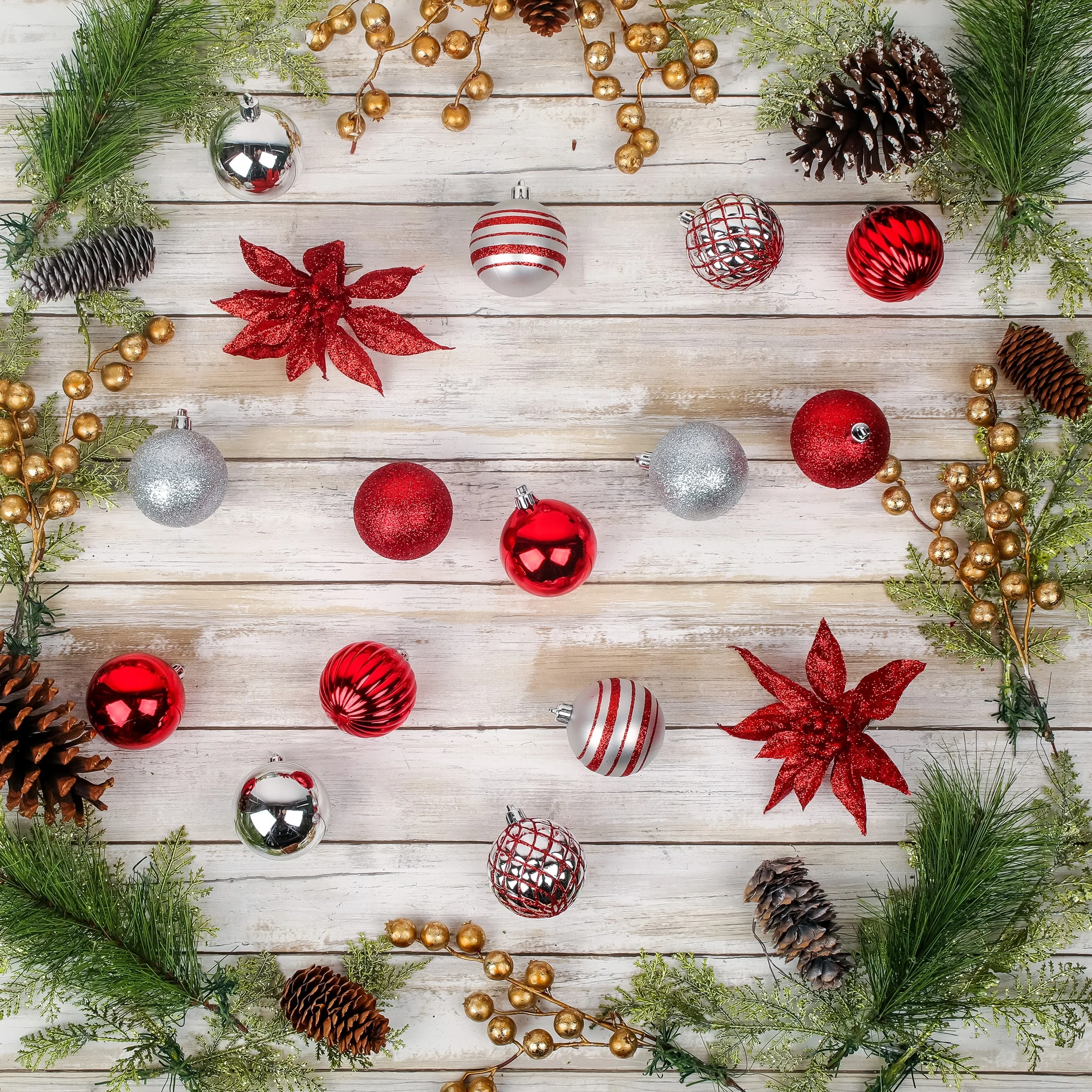 National Tree Company 2 in. Shatterproof Christmas Ornament Set, Red and Silver, 40 Balls and 4 Flowers - 2 in