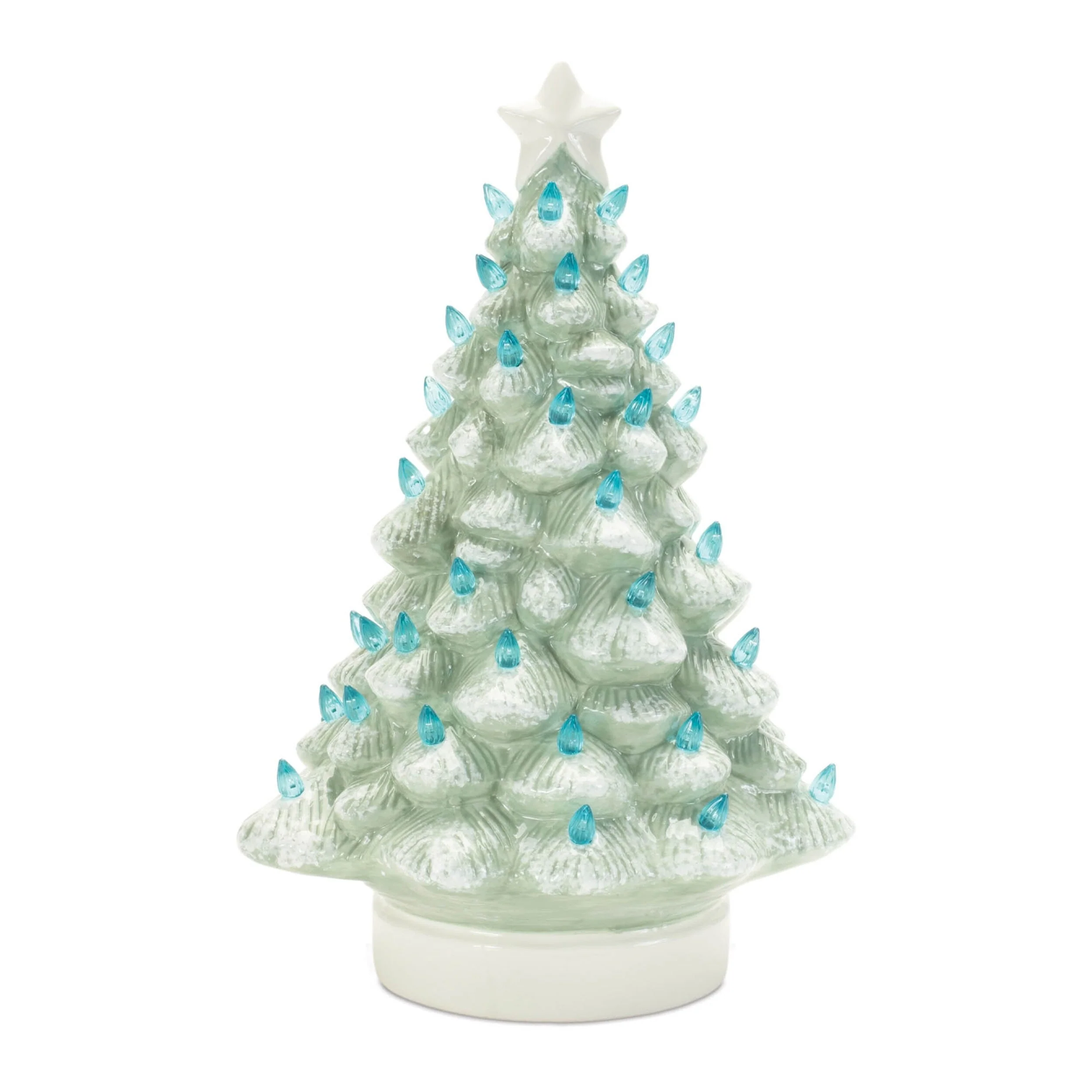 Set of 2 Lighted Ceramic Christmas Tree Blue and Green Holiday Table Decorations with LED Lights - 7.75”L x 7.75” x 11.5”H