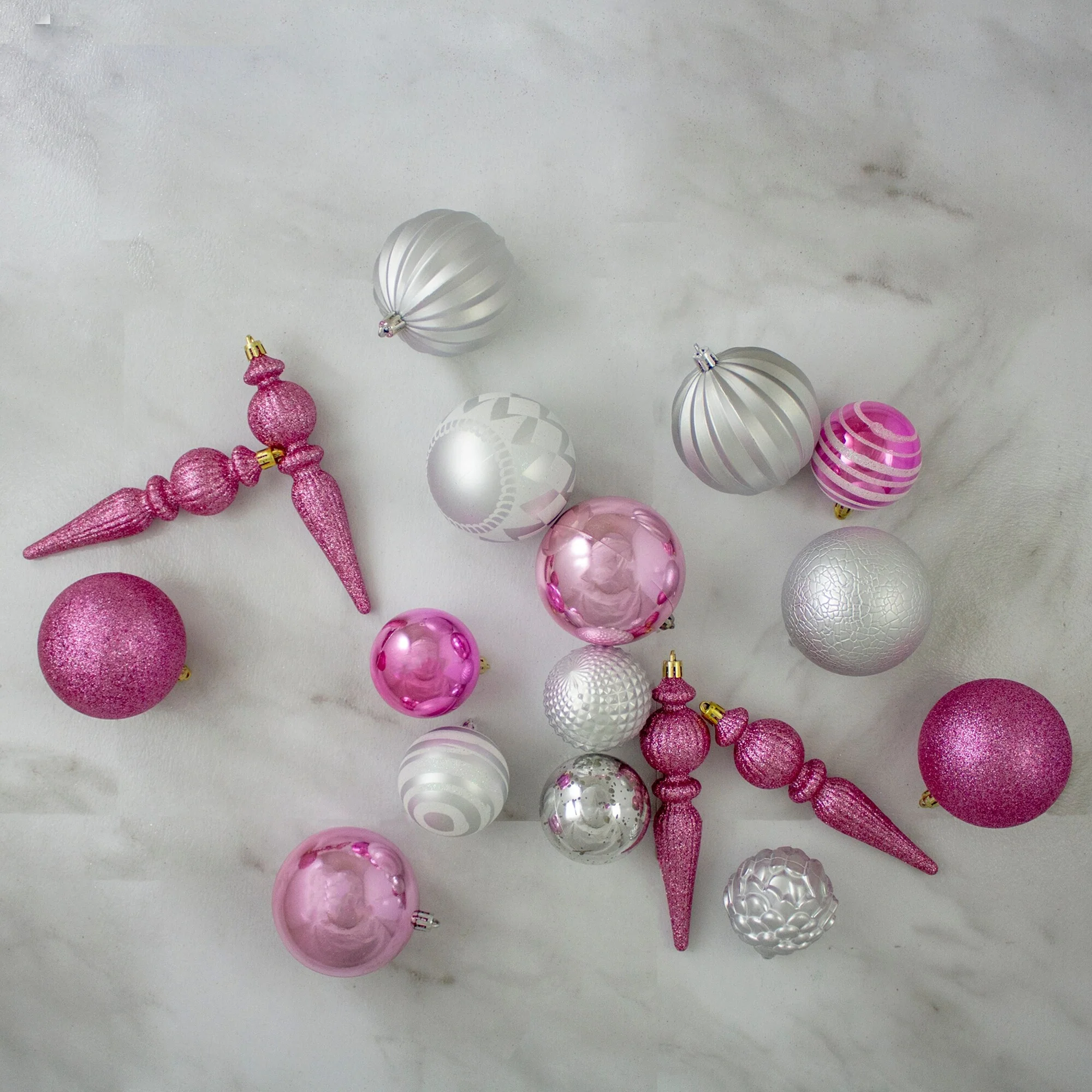 Shatterproof 3-Finish Christmas Ball and Finial Ornaments - Pink and Silver - 75ct