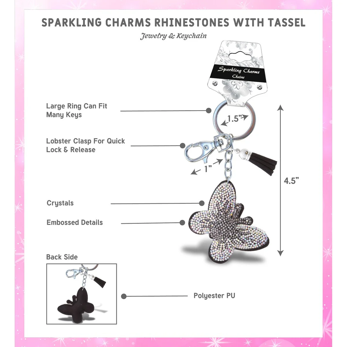 Aqua79 Butterfly Keychain - Grey Sparkling Rhinestones Charm w/ Tassel - 2.25 x 2.25 x 0.25 inches