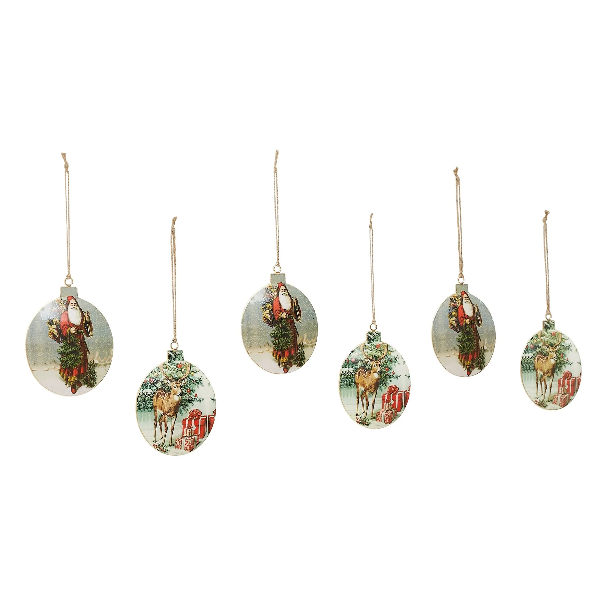 Vintage Santa and Reindeer Metal Ornaments Set of 6 - 4.75 inch