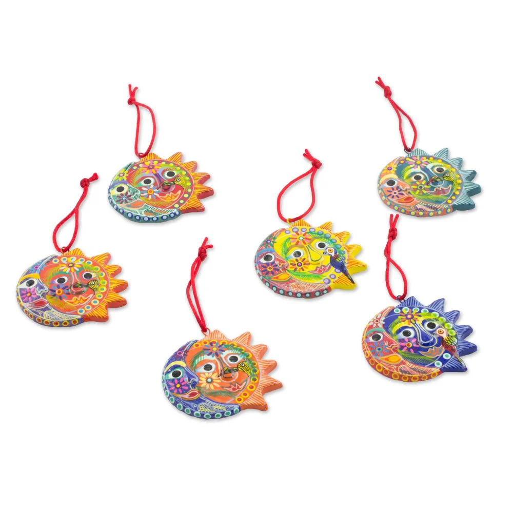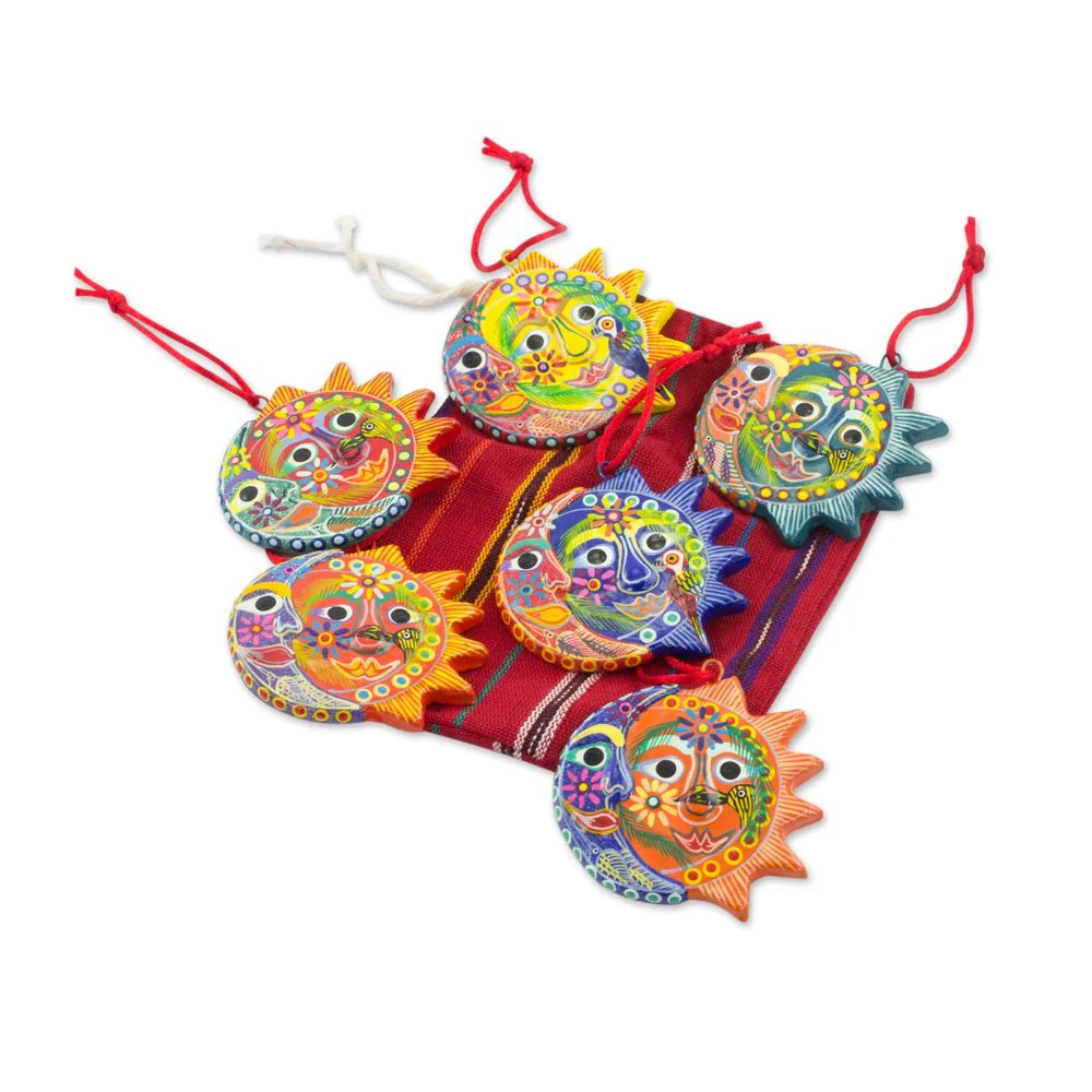 Handmade Set of 6 Ceramic Ornaments, 'Flower Eclipse' (Guatemala)