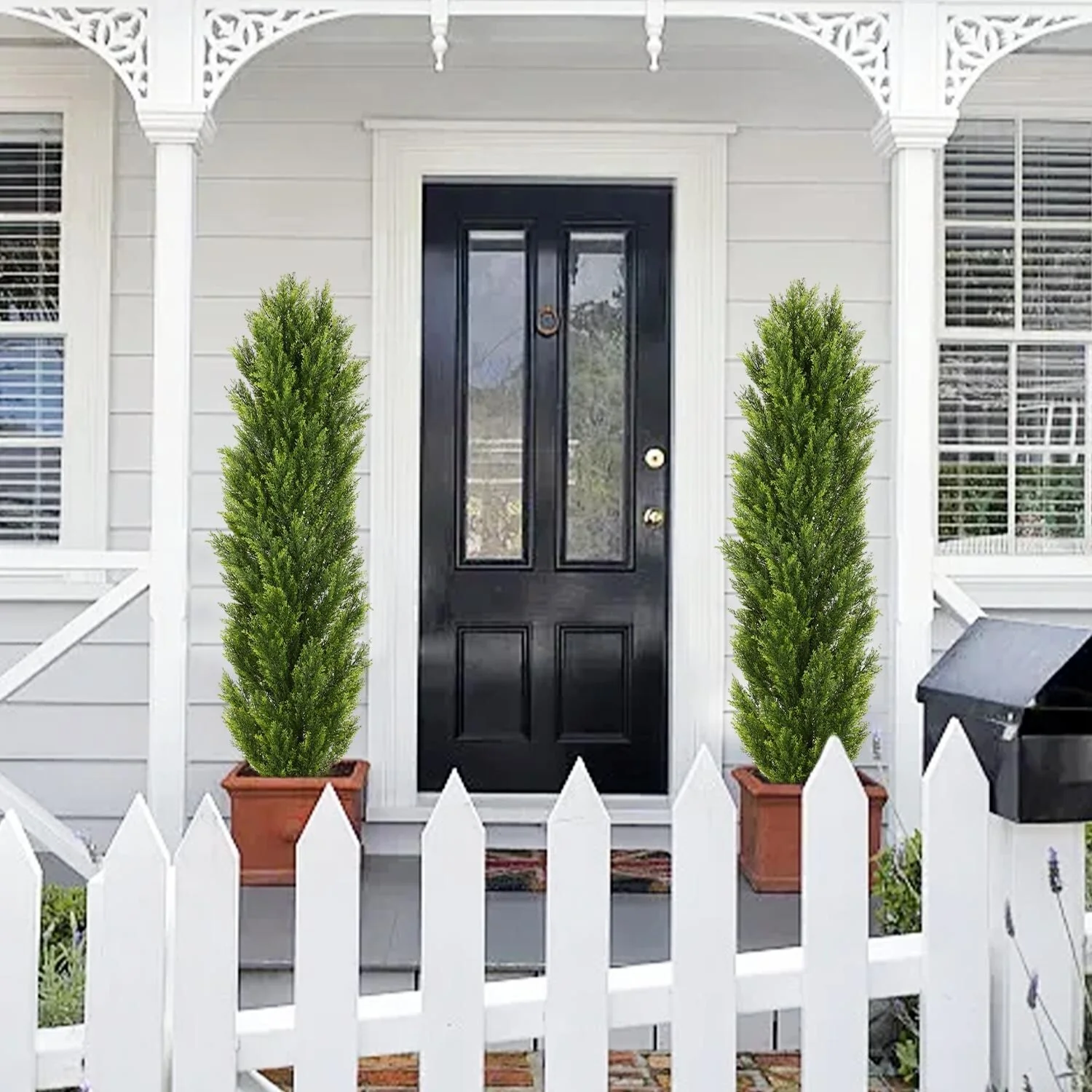 • Set Includes: 2 Faux Boxwood Pine Greenery Trees