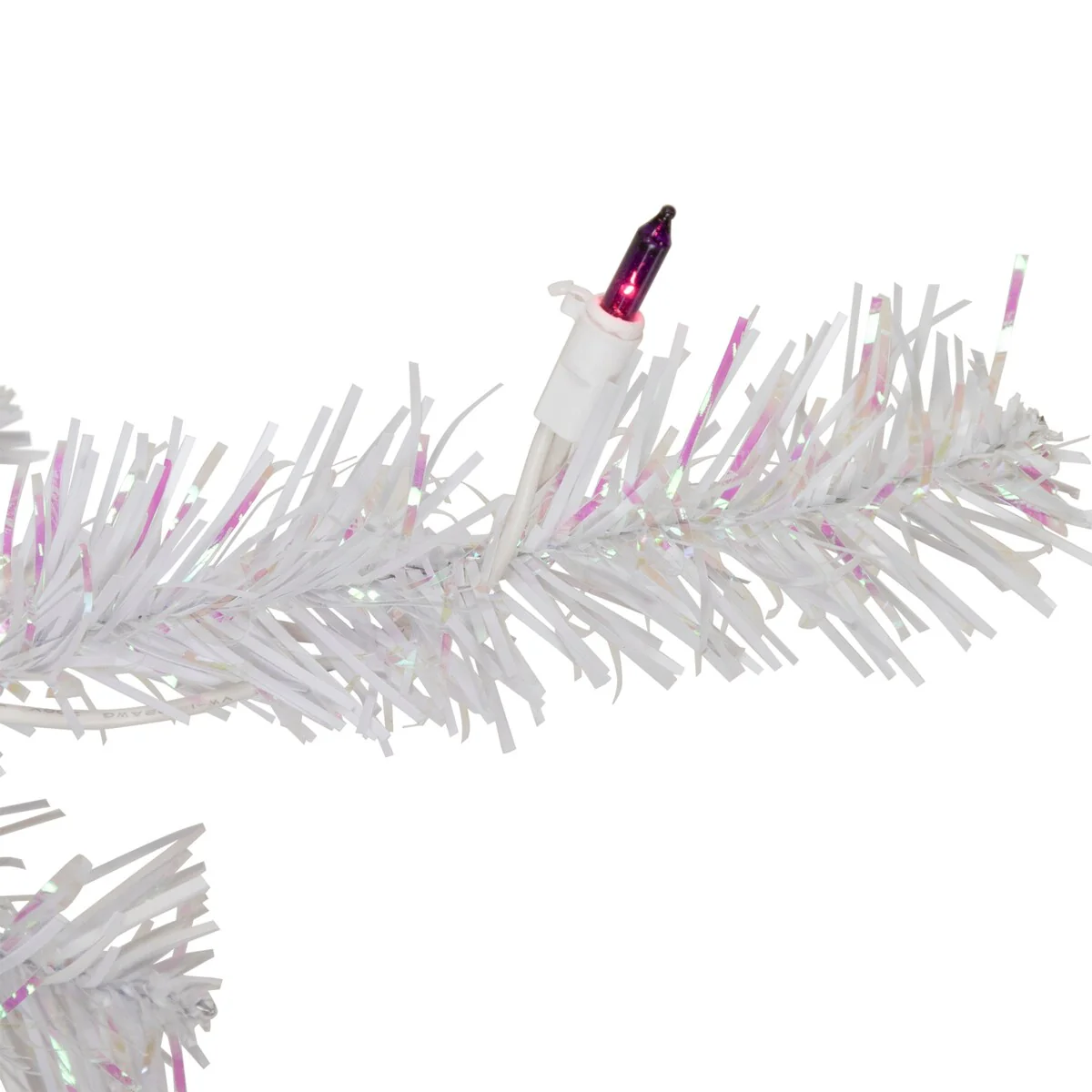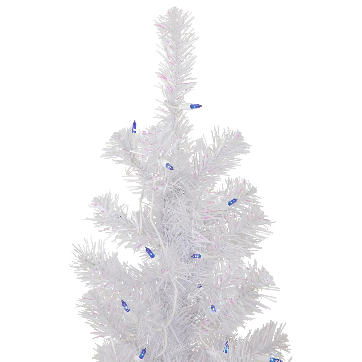 With its immaculate color and generous profile the Rockport White Pine Christmas tree glistens with wintry beauty. It is a designer-inspired alternative to a traditional green tree with its dazzling white pine needles. The branches contain a mix of matte white and clear iridescent needles that create texture and add depth to the tree. The iridescent needles beautifully reflect the soft glow from the blue incandescent mini lights. This tree is perfect for a quick and easy setup and ideal for corners or tabletops.