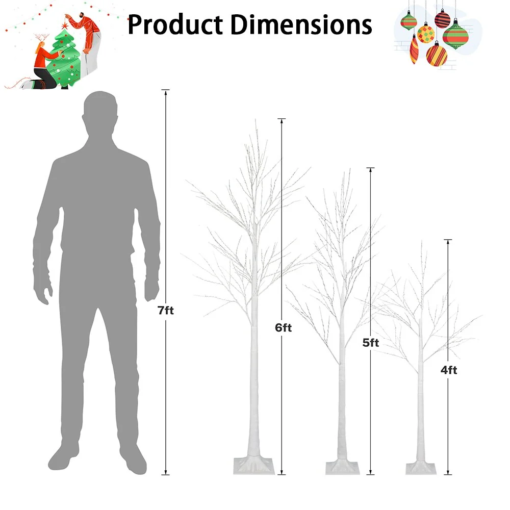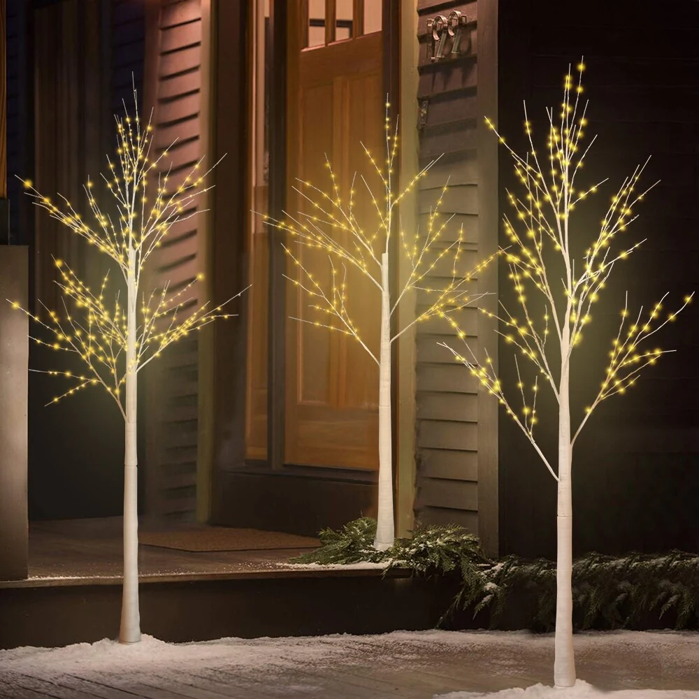 - Set of 3 birch trees: 4FT/5FT/6FT with warm white LED lights