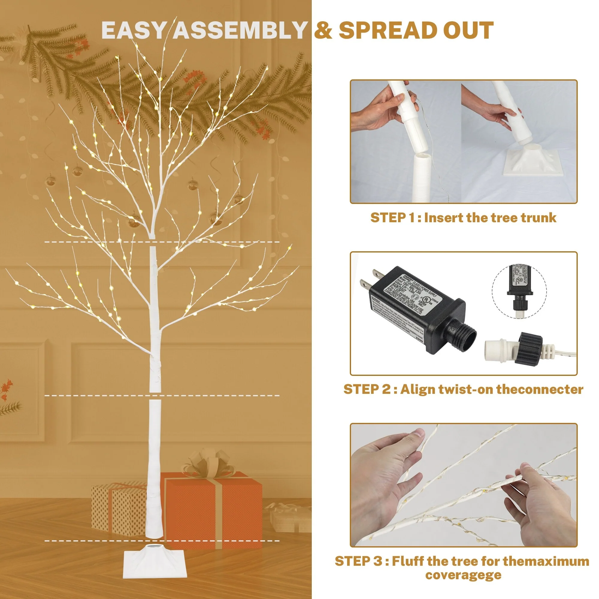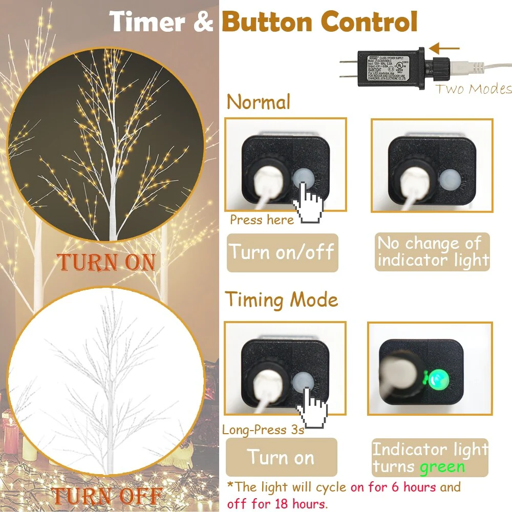 Create a cozy and welcoming atmosphere in your home with this set of 3 LED lighted birch trees. The pack includes 4FT, 5FT, and 6FT sizes, each covered with natural-looking bark texture and warm white lights. These trees are perfect for year-round decoration in your yard, living room, or front door thanks to their waterproof UL-certified adapter. The bendable branches can be easily reshaped to suit your needs, making them perfect for hanging delicate ornaments or accessories. Use these beautiful trees to add a festive touch to your wedding, Christmas decor, or any party occasion.