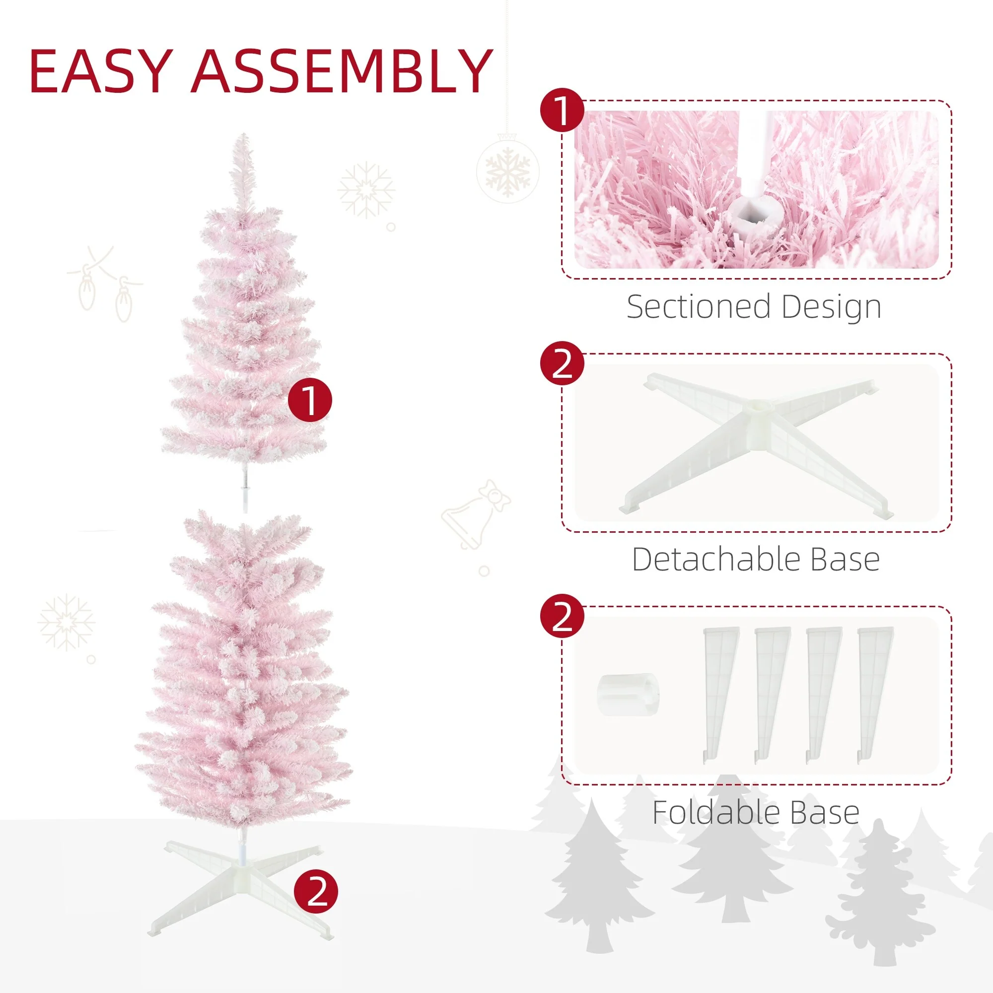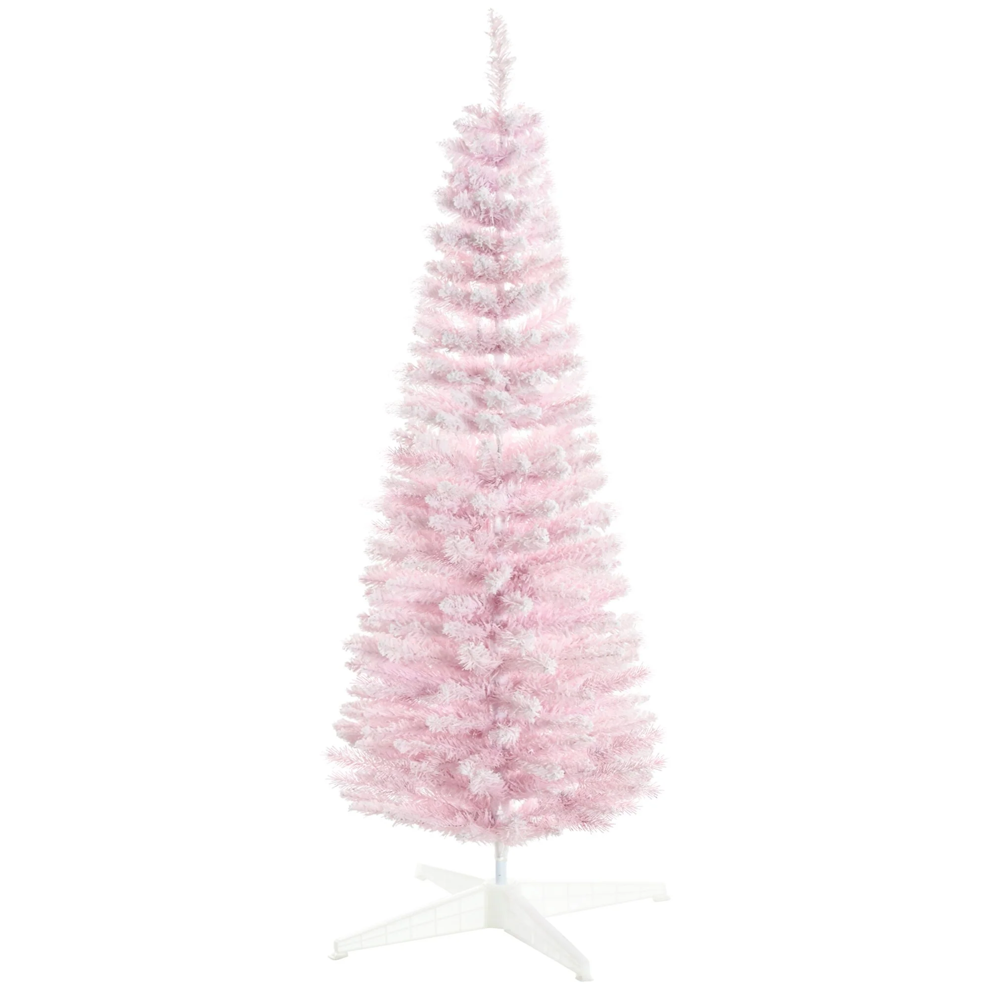 Bring holiday cheer to your home with this charming 5' Snow Flocked Artificial Pencil Christmas Tree. Featuring realistic snow-flocked branches in a playful pink hue, this slim tree adds a festive touch to your decor while eliminating the hassle of traditional tree maintenance.