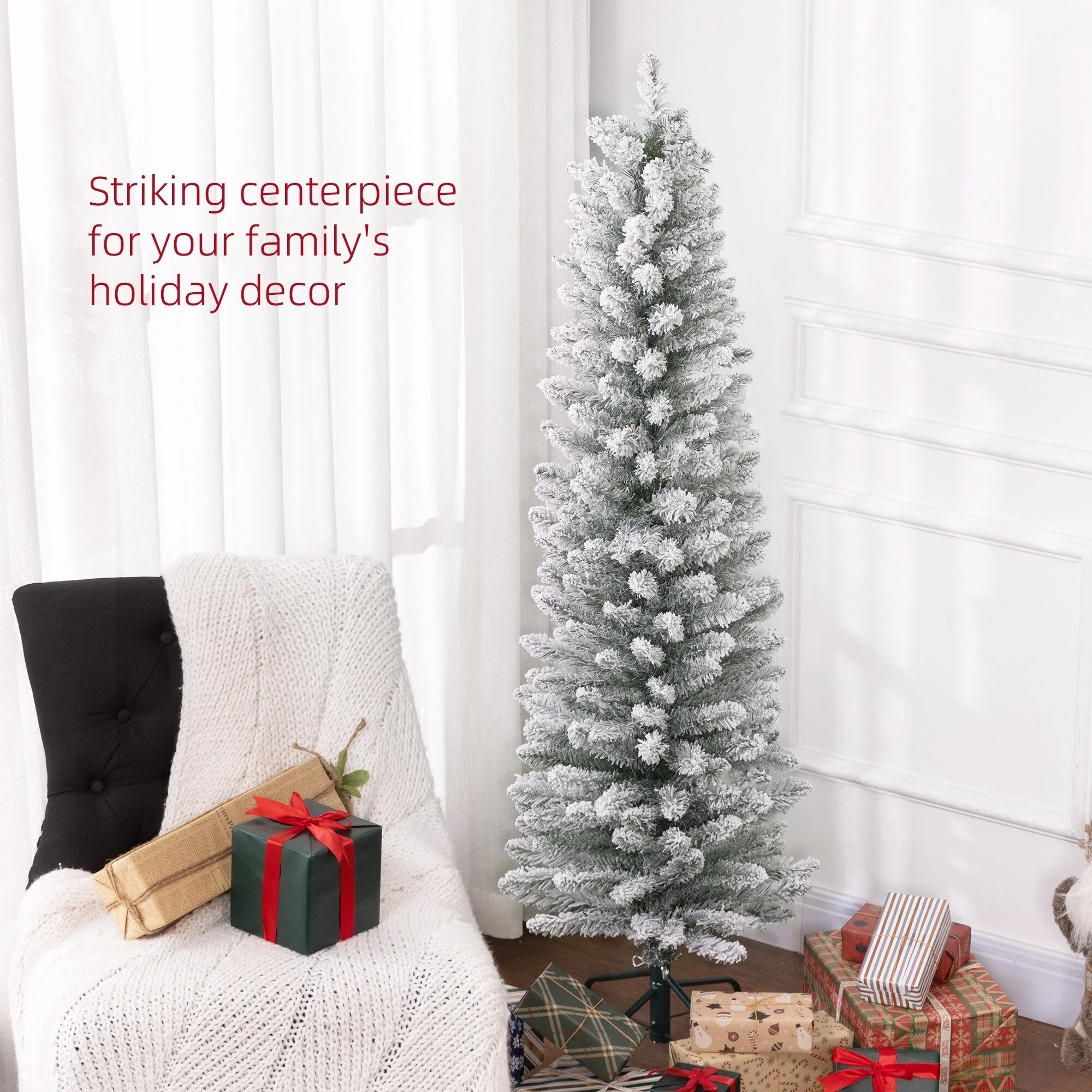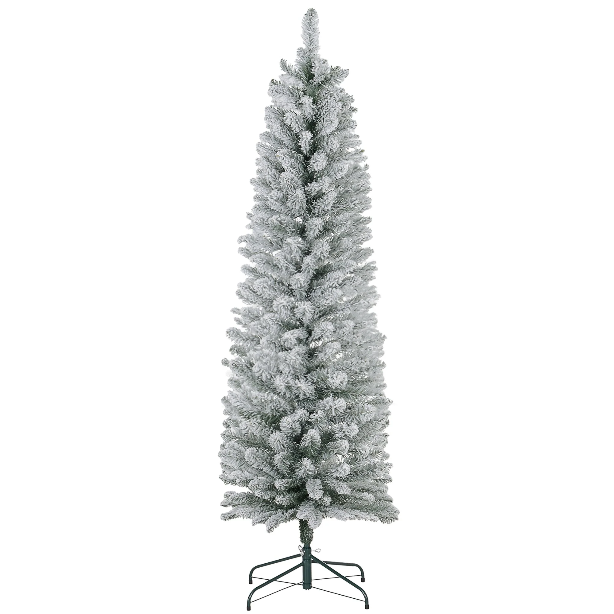 This 5ft Artificial Pencil Christmas Tree offers a slim, snow-flocked design perfect for small spaces. Featuring 263 realistic branch tips and a sturdy metal base, this tree brings a festive, frosty touch to your holiday decor with easy setup and compact storage.
