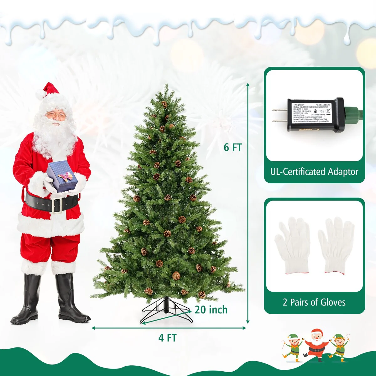 Rapid 3-Minute Shaping: Setting up your Christmas tree has never been faster. With our upgraded hinged design, the tree takes just 3 minutes to shape. The branches expand automatically and are designed to resist deformation. For added convenience, we include 2 pairs of gloves for hand protection during setup.