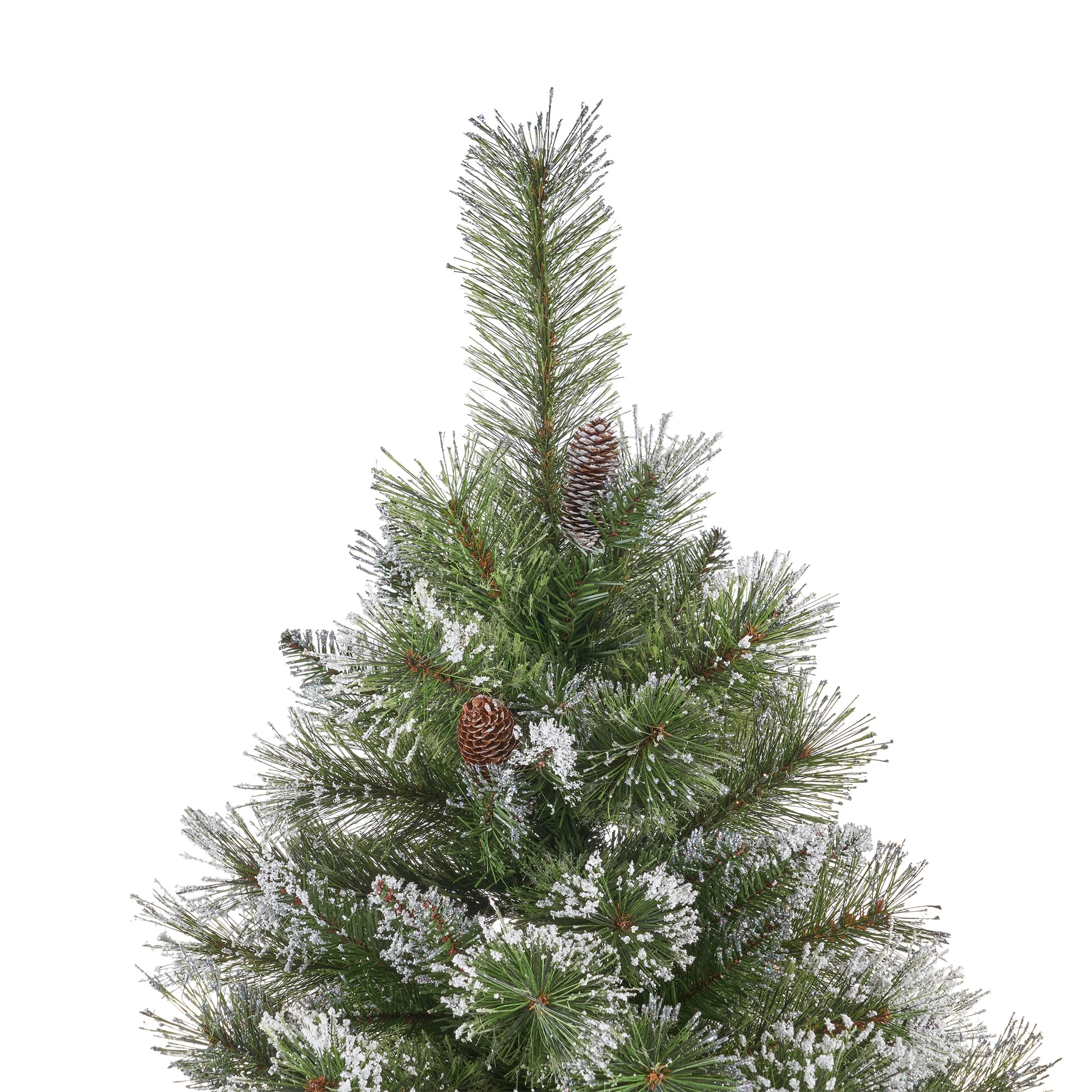 Create a festive winter wonderland with this 7.5' Bristle Mixed Hinged Christmas Tree. Featuring snow, glitter accents, and 86 frosted pine cones, this unlit tree allows you to personalize your holiday decor with your own lights. The hinged design makes assembly simple and quick, while the sturdy iron stand ensures that your tree stays stable throughout the season.