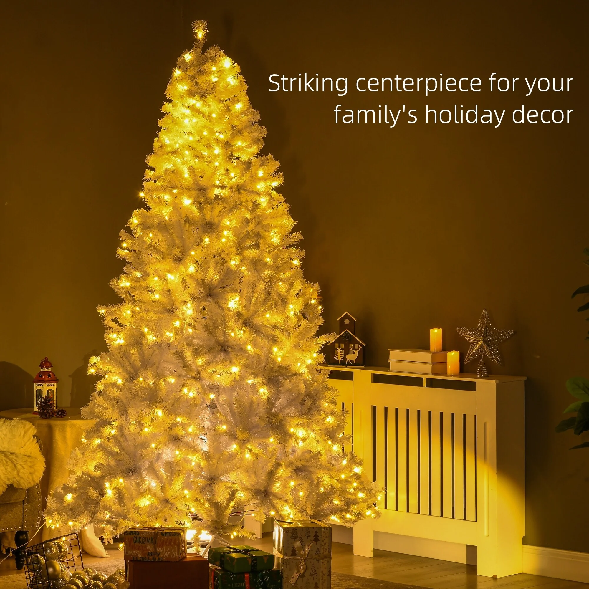 Bring the magic of the holidays into your home with our 7.5ft Tall Prelit Artificial Christmas Tree. With 1518 branch tips and 500 warm white LED lights, this tree illuminates your space with a soft, festive glow. Its stunning white leaves create a modern aesthetic that complements any decor style, making it a standout centerpiece for your holiday festivities.