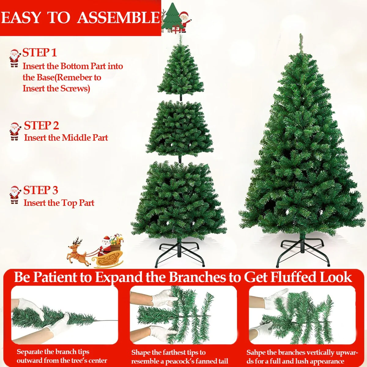 Easy to Assemble: Setting up your Christmas tree is a breeze thanks to the pre-attached hinged branches. Assemble your tree in three simple steps by stacking the sections and arranging the branches. For the fullest and most luxurious appearance, allocate 45-60 minutes to shape the tree to your preference. Protective gloves are included for your convenience.