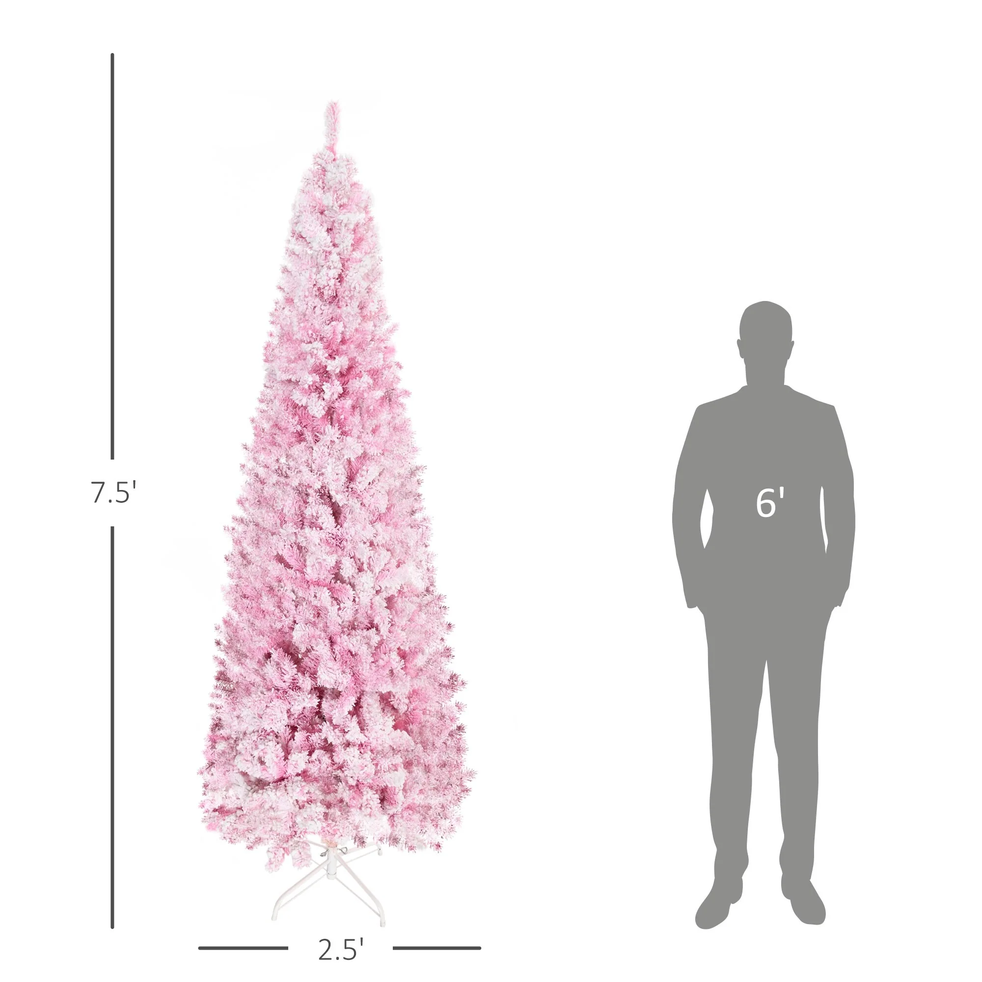 Celebrate the holidays with the HOMCOM 7.5ft Pink Slim Pencil Artificial Christmas Tree. This elegant tree features 818 realistic branch tips and a sleek design, providing a full and natural look that enhances any indoor space. The snow-flocked pink leaves add a touch of winter magic, making it a captivating centerpiece for your festive decorations. Perfect for those seeking a durable and maintenance-free Christmas tree, this model combines elegance with practicality for your holiday celebrations.