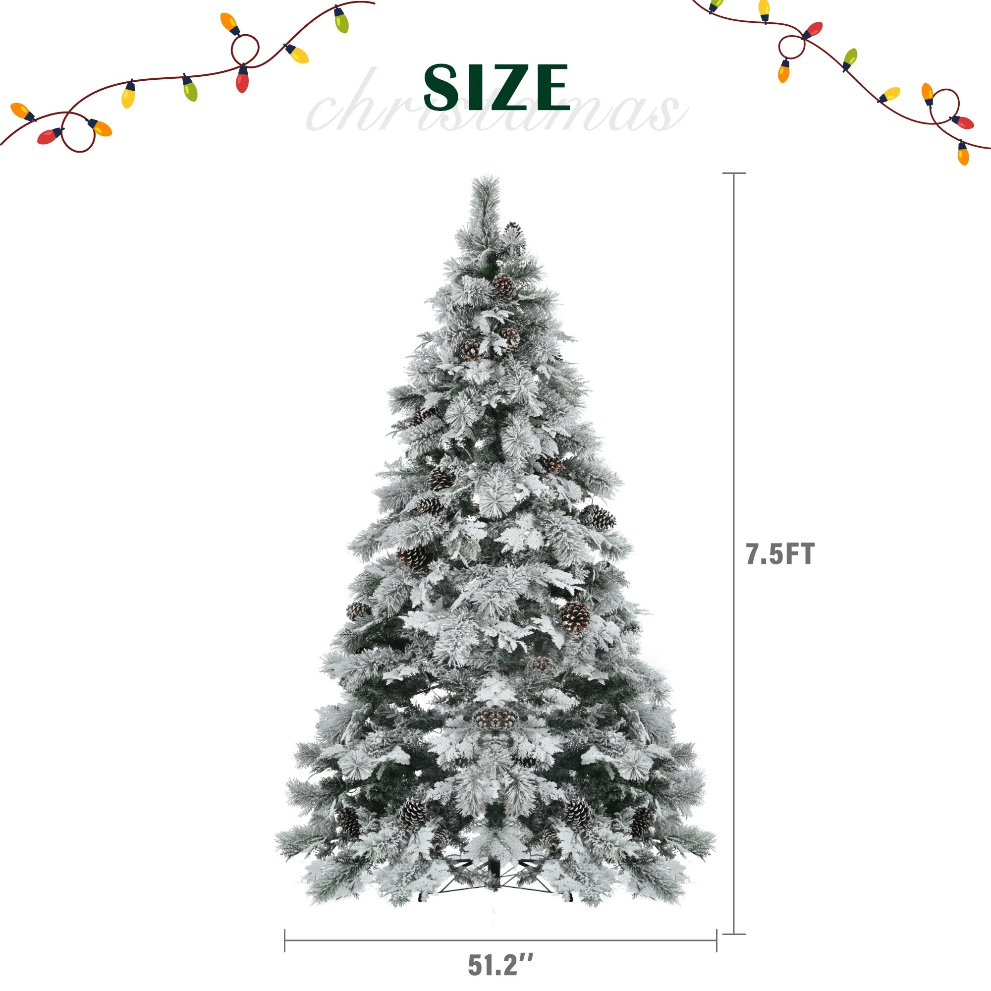 This 7.5FT Pre-Lit Snow Flocked Spruce Christmas Tree offers a stunningly realistic appearance, with 745 branch tips designed to replicate the lush fullness of a natural tree. Adorned with pine cones and snow-flocked leaves, it brings a touch of winter wonder to any space. Pre-lit with 450 multi-color LED lights, the tree features 11 flashing modes, giving you the flexibility to create different lighting effects. Whether you're looking for a calming glow or a vibrant, flashing light display, this tree has it all. The tree's sturdy base and hinged design ensure it's easy to assemble and store.