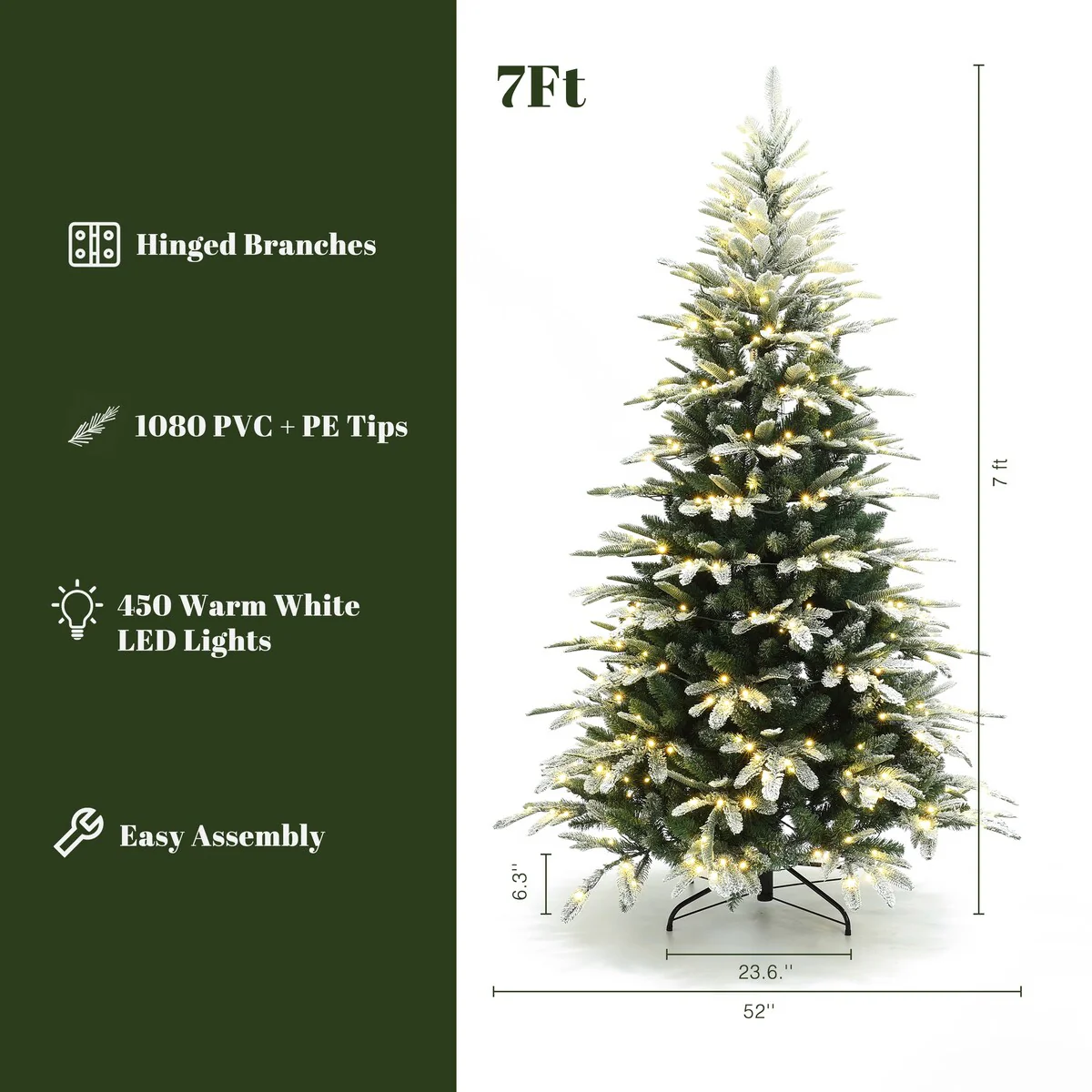 Illuminate your holiday season with elegance and splendor with our 7-foot Pre-Lit Snow-Flocked Christmas Tree, adorned with 450 warm white LED lights. This enchanting centerpiece brings the serene essence of a winter wonderland right into your home, creating a cozy and inviting atmosphere for family gatherings, festive celebrations, and cherished moments. Crafted with 1080 lush PE and PVC tips, our Christmas tree with lights boasts a rich, full-bodied appearance that mimics the intricate beauty of a real snow-covered fir tree. The branches are meticulously designed and snow-flocked, creating the perfect white Christmas ambiance for your space, regardless of the outdoor weather. Featuring hinged branches and a sturdy, durable metal stand, the tree is remarkably easy to assemble, transforming your space into a festive sanctuary in no time. The plug-in mode ensures a reliable, continuous glow, enveloping your space in a warm, welcoming light.